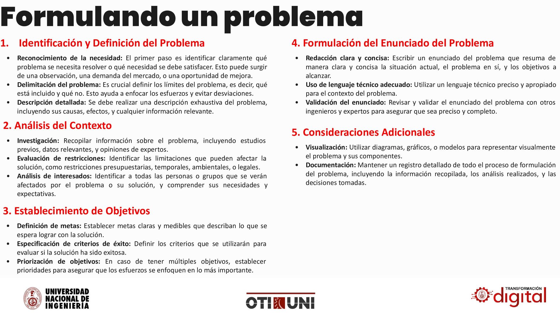 paso es identificar claramente qué problema se necesita resolver o qué necesidad se debe satisfacer. Esto puede surgir de una observación, una demanda del mercado, o una oportunidad de mejora. • Delimitación del problema: Es crucial definir los límites del problema, es decir, qué está incluido y qué no. Esto ayuda a enfocar los esfuerzos y evitar desviaciones. • Descripción detallada: Se debe realizar una descripción exhaustiva del problema, incluyendo sus causas, efectos, y cualquier información relevante. 1. Identificación y Definición del Problema • Investigación: Recopilar información sobre el problema, incluyendo estudios previos, datos relevantes, y opiniones de expertos. • Evaluación de restricciones: Identificar las limitaciones que pueden afectar la solución, como restricciones presupuestarias, temporales, ambientales, o legales. • Análisis de interesados: Identificar a todas las personas o grupos que se verán afectados por el problema o su solución, y comprender sus necesidades y expectativas. 2. Análisis del Contexto • Definición de metas: Establecer metas claras y medibles que describan lo que se espera lograr con la solución. • Especificación de criterios de éxito: Definir los criterios que se utilizarán para evaluar si la solución ha sido exitosa. • Priorización de objetivos: En caso de tener múltiples objetivos, establecer prioridades para asegurar que los esfuerzos se enfoquen en lo más importante. 3. Establecimiento de Objetivos • Redacción clara y concisa: Escribir un enunciado del problema que resuma de manera clara y concisa la situación actual, el problema en sí, y los objetivos a alcanzar. • Uso de lenguaje técnico adecuado: Utilizar un lenguaje técnico preciso y apropiado para el contexto del problema. • Validación del enunciado: Revisar y validar el enunciado del problema con otros ingenieros y expertos para asegurar que sea preciso y completo. 4. Formulación del Enunciado del Problema • Visualización: Utilizar diagramas, gráficos, o modelos para representar visualmente el problema y sus componentes. • Documentación: Mantener un registro detallado de todo el proceso de formulación del problema, incluyendo la información recopilada, los análisis realizados, y las decisiones tomadas. 5. Consideraciones Adicionales