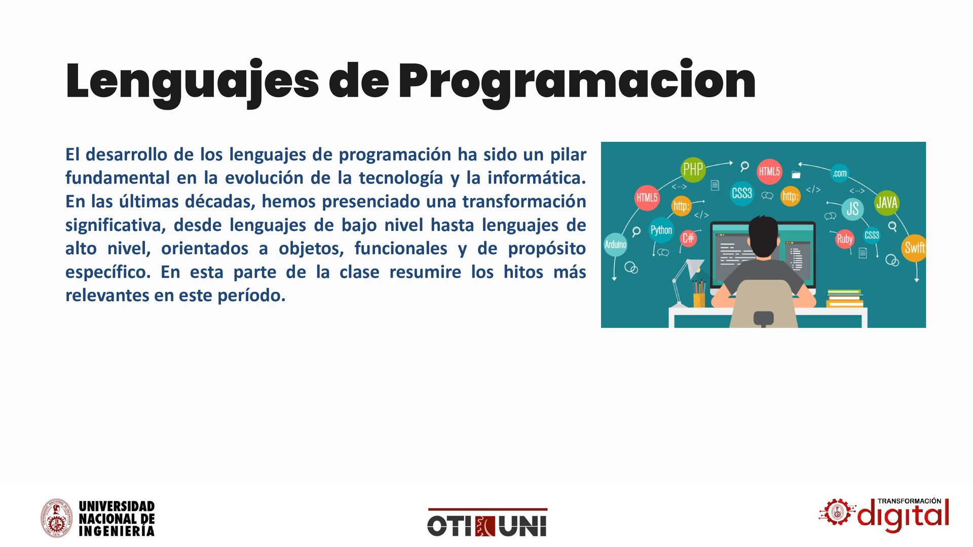 ha sido un pilar fundamental en la evolución de la tecnología y la informática. En las últimas décadas, hemos presenciado una transformación significativa, desde lenguajes de bajo nivel hasta lenguajes de alto nivel, orientados a objetos, funcionales y de propósito específico. En esta parte de la clase resumire los hitos más relevantes en este período.