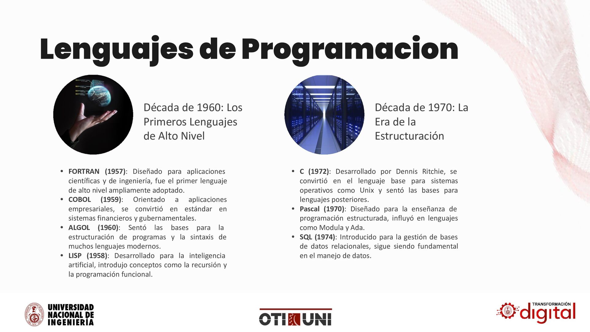 FORTRAN (1957): Diseñado para aplicaciones científicas y de ingeniería, fue el primer lenguaje de alto nivel ampliamente adoptado. • COBOL (1959): Orientado a aplicaciones empresariales, se convirtió en estándar en sistemas financieros y gubernamentales. • ALGOL (1960): Sentó las bases para la estructuración de programas y la sintaxis de muchos lenguajes modernos. • LISP (1958): Desarrollado para la inteligencia artificial, introdujo conceptos como la recursión y la programación funcional. Década de 1970: La Era de la Estructuración • C (1972): Desarrollado por Dennis Ritchie, se convirtió en el lenguaje base para sistemas operativos como Unix y sentó las bases para lenguajes posteriores. • Pascal (1970): Diseñado para la enseñanza de programación estructurada, influyó en lenguajes como Modula y Ada. • SQL (1974): Introducido para la gestión de bases de datos relacionales, sigue siendo fundamental en el manejo de datos. Lenguajes de Programacion