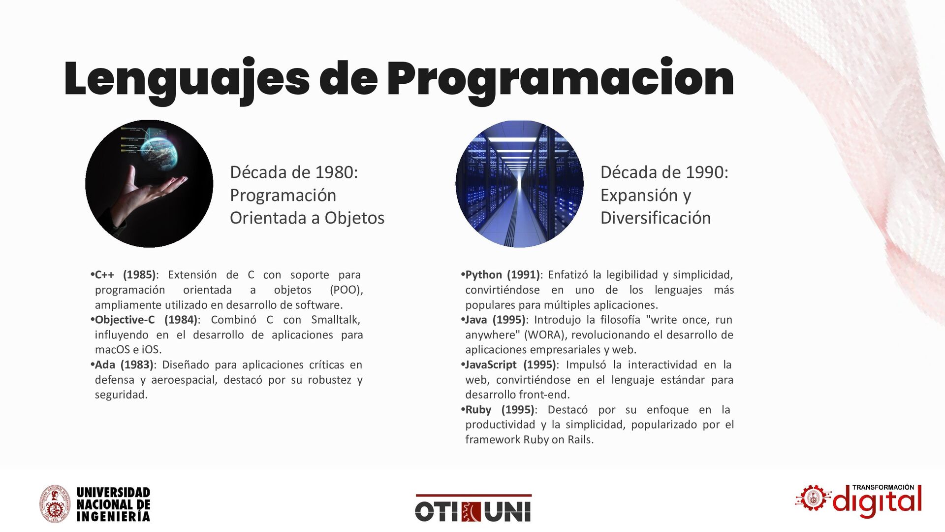 de C con soporte para programación orientada a objetos (POO), ampliamente utilizado en desarrollo de software. •Objective-C (1984): Combinó C con Smalltalk, influyendo en el desarrollo de aplicaciones para macOS e iOS. •Ada (1983): Diseñado para aplicaciones críticas en defensa y aeroespacial, destacó por su robustez y seguridad. Década de 1990: Expansión y Diversificación •Python (1991): Enfatizó la legibilidad y simplicidad, convirtiéndose en uno de los lenguajes más populares para múltiples aplicaciones. •Java (1995): Introdujo la filosofía "write once, run anywhere" (WORA), revolucionando el desarrollo de aplicaciones empresariales y web. •JavaScript (1995): Impulsó la interactividad en la web, convirtiéndose en el lenguaje estándar para desarrollo front-end. •Ruby (1995): Destacó por su enfoque en la productividad y la simplicidad, popularizado por el framework Ruby on Rails. Lenguajes de Programacion