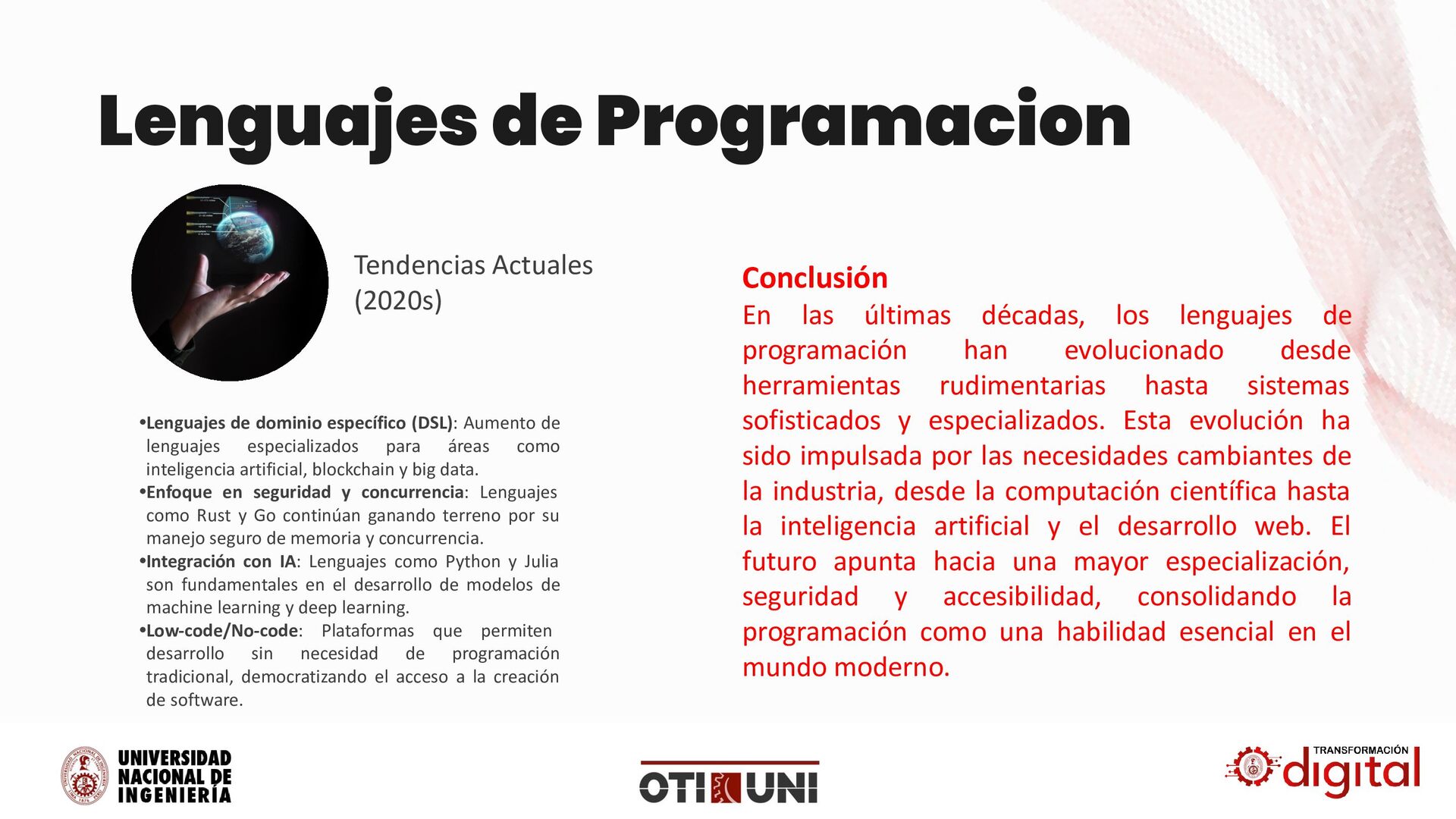 lenguajes especializados para áreas como inteligencia artificial, blockchain y big data. •Enfoque en seguridad y concurrencia: Lenguajes como Rust y Go continúan ganando terreno por su manejo seguro de memoria y concurrencia. •Integración con IA: Lenguajes como Python y Julia son fundamentales en el desarrollo de modelos de machine learning y deep learning. •Low-code/No-code: Plataformas que permiten desarrollo sin necesidad de programación tradicional, democratizando el acceso a la creación de software. Lenguajes de Programacion Conclusión En las últimas décadas, los lenguajes de programación han evolucionado desde herramientas rudimentarias hasta sistemas sofisticados y especializados. Esta evolución ha sido impulsada por las necesidades cambiantes de la industria, desde la computación científica hasta la inteligencia artificial y el desarrollo web. El futuro apunta hacia una mayor especialización, seguridad y accesibilidad, consolidando la programación como una habilidad esencial en el mundo moderno.