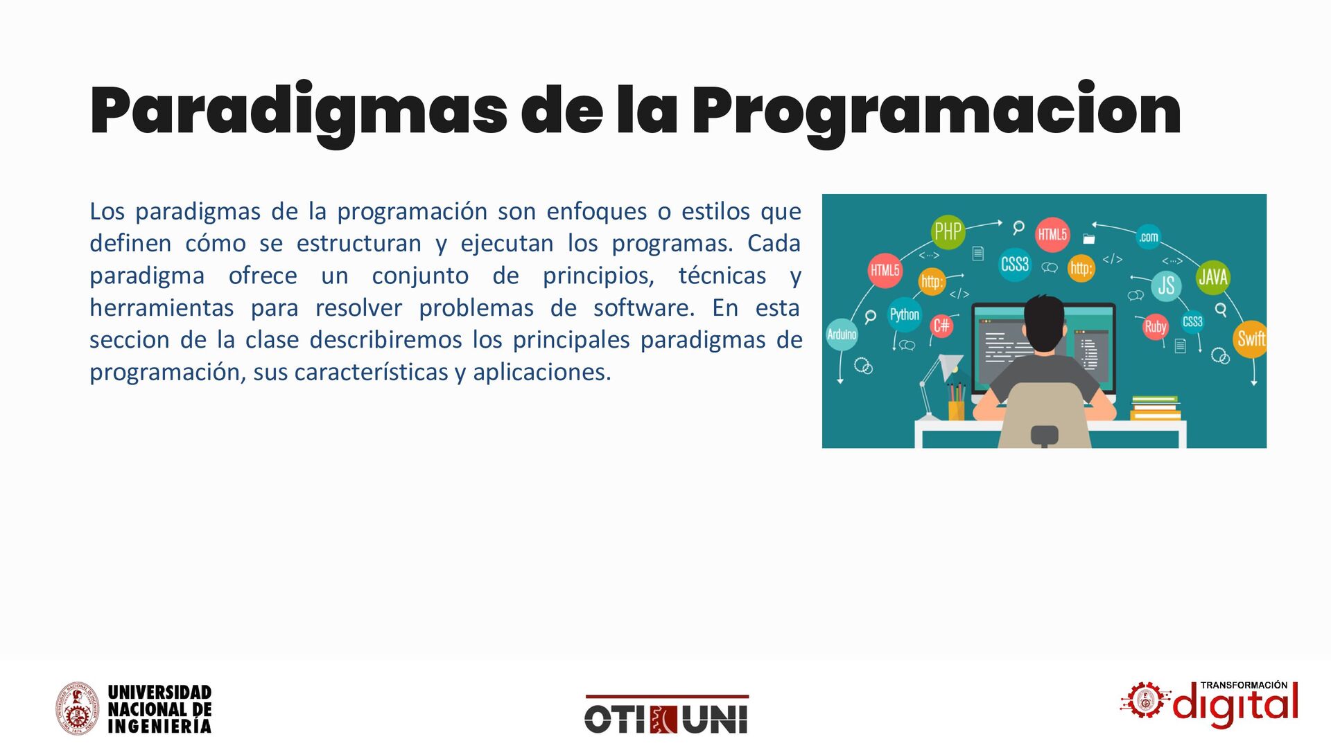 enfoques o estilos que definen cómo se estructuran y ejecutan los programas. Cada paradigma ofrece un conjunto de principios, técnicas y herramientas para resolver problemas de software. En esta seccion de la clase describiremos los principales paradigmas de programación, sus características y aplicaciones.