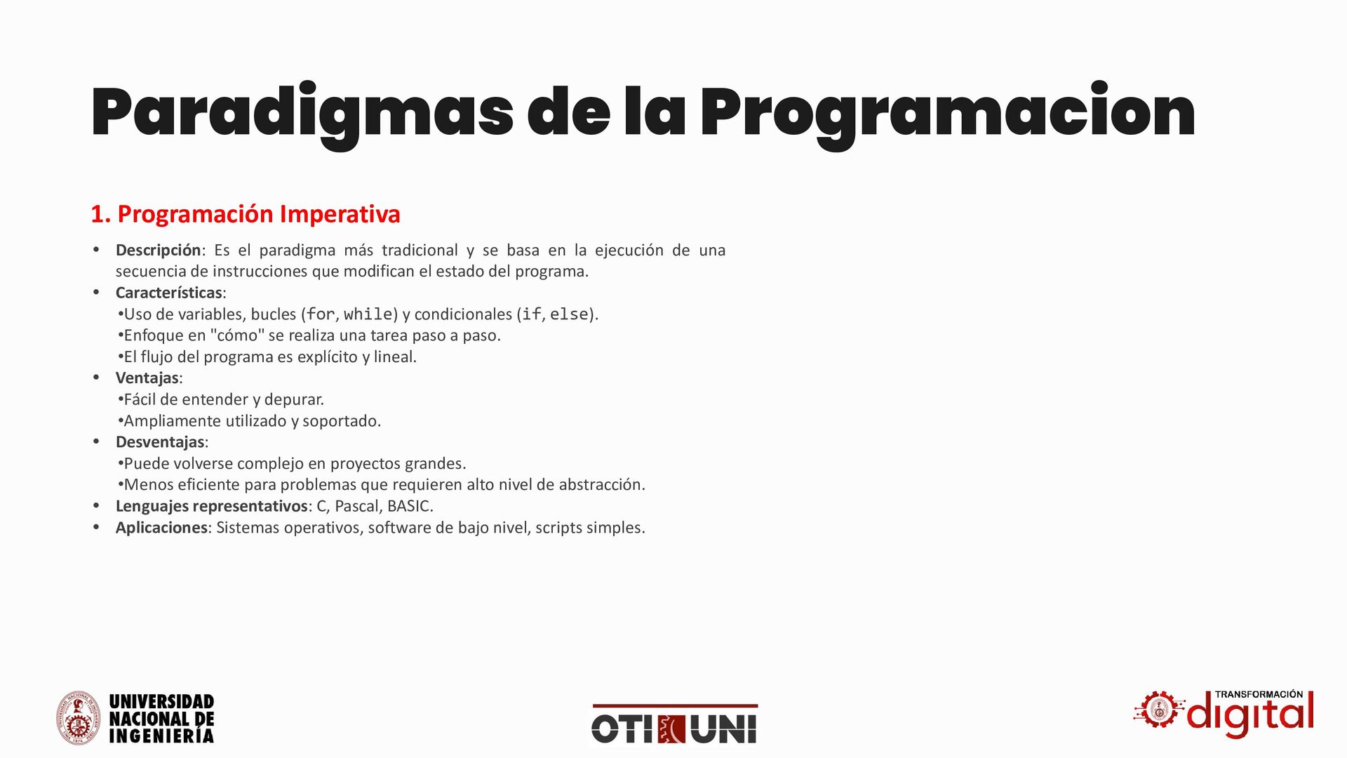 tradicional y se basa en la ejecución de una secuencia de instrucciones que modifican el estado del programa. • Características: •Uso de variables, bucles (for, while) y condicionales (if, else). •Enfoque en "cómo" se realiza una tarea paso a paso. •El flujo del programa es explícito y lineal. • Ventajas: •Fácil de entender y depurar. •Ampliamente utilizado y soportado. • Desventajas: •Puede volverse complejo en proyectos grandes. •Menos eficiente para problemas que requieren alto nivel de abstracción. • Lenguajes representativos: C, Pascal, BASIC. • Aplicaciones: Sistemas operativos, software de bajo nivel, scripts simples. 1. Programación Imperativa