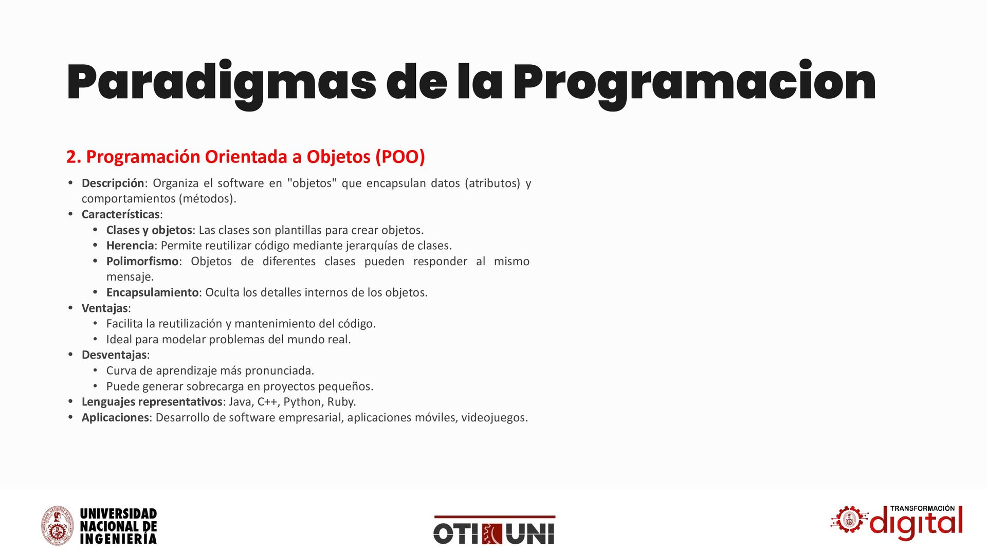 "objetos" que encapsulan datos (atributos) y comportamientos (métodos). • Características: • Clases y objetos: Las clases son plantillas para crear objetos. • Herencia: Permite reutilizar código mediante jerarquías de clases. • Polimorfismo: Objetos de diferentes clases pueden responder al mismo mensaje. • Encapsulamiento: Oculta los detalles internos de los objetos. • Ventajas: • Facilita la reutilización y mantenimiento del código. • Ideal para modelar problemas del mundo real. • Desventajas: • Curva de aprendizaje más pronunciada. • Puede generar sobrecarga en proyectos pequeños. • Lenguajes representativos: Java, C++, Python, Ruby. • Aplicaciones: Desarrollo de software empresarial, aplicaciones móviles, videojuegos. 2. Programación Orientada a Objetos (POO)