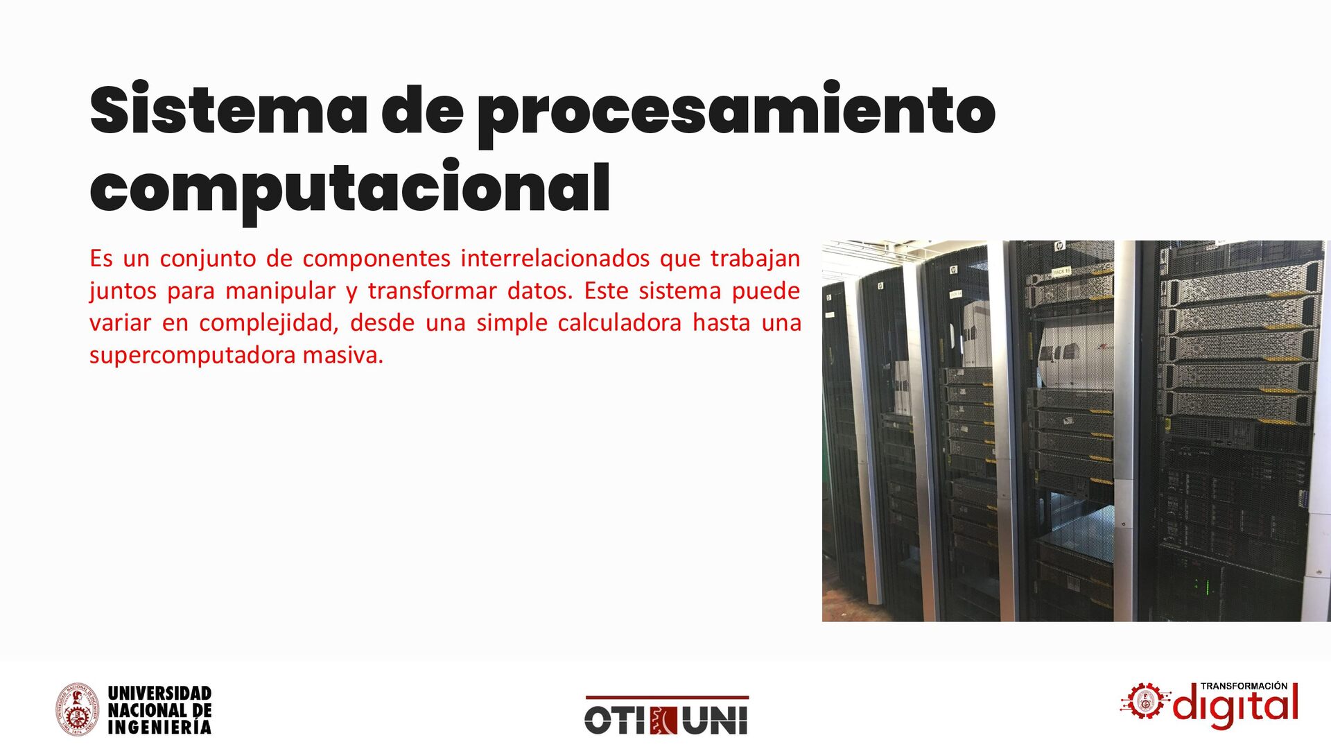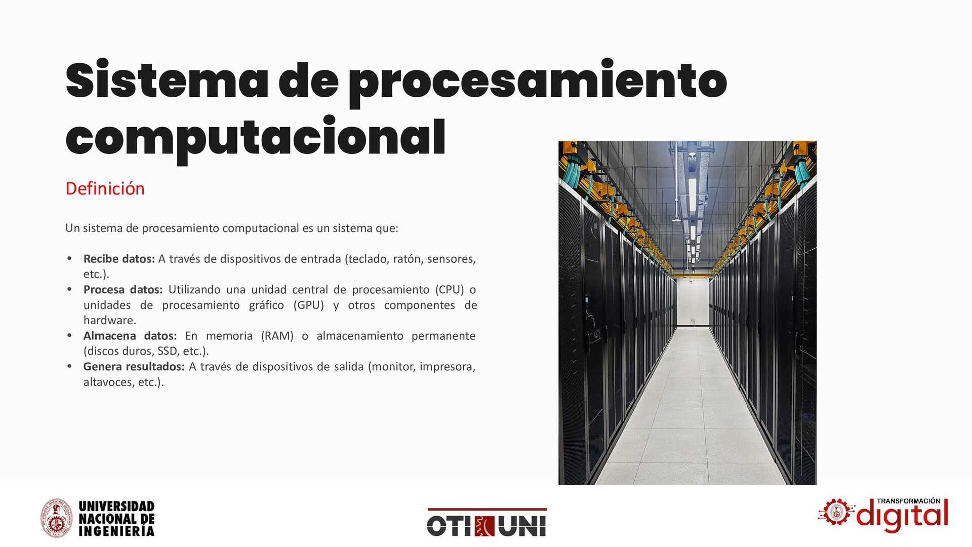 es un sistema que: • Recibe datos: A través de dispositivos de entrada (teclado, ratón, sensores, etc.). • Procesa datos: Utilizando una unidad central de procesamiento (CPU) o unidades de procesamiento gráfico (GPU) y otros componentes de hardware. • Almacena datos: En memoria (RAM) o almacenamiento permanente (discos duros, SSD, etc.). • Genera resultados: A través de dispositivos de salida (monitor, impresora, altavoces, etc.).