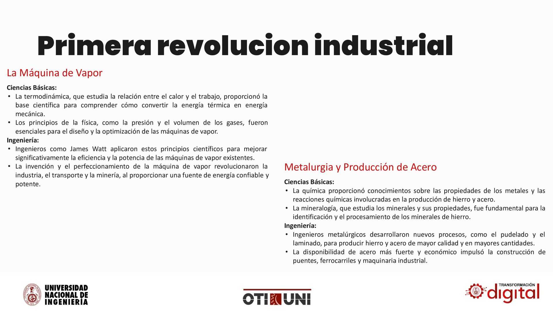 la relación entre el calor y el trabajo, proporcionó la base científica para comprender cómo convertir la energía térmica en energía mecánica. • Los principios de la física, como la presión y el volumen de los gases, fueron esenciales para el diseño y la optimización de las máquinas de vapor. Ingeniería: • Ingenieros como James Watt aplicaron estos principios científicos para mejorar significativamente la eficiencia y la potencia de las máquinas de vapor existentes. • La invención y el perfeccionamiento de la máquina de vapor revolucionaron la industria, el transporte y la minería, al proporcionar una fuente de energía confiable y potente. La Máquina de Vapor Ciencias Básicas: • La química proporcionó conocimientos sobre las propiedades de los metales y las reacciones químicas involucradas en la producción de hierro y acero. • La mineralogía, que estudia los minerales y sus propiedades, fue fundamental para la identificación y el procesamiento de los minerales de hierro. Ingeniería: • Ingenieros metalúrgicos desarrollaron nuevos procesos, como el pudelado y el laminado, para producir hierro y acero de mayor calidad y en mayores cantidades. • La disponibilidad de acero más fuerte y económico impulsó la construcción de puentes, ferrocarriles y maquinaria industrial. Metalurgia y Producción de Acero