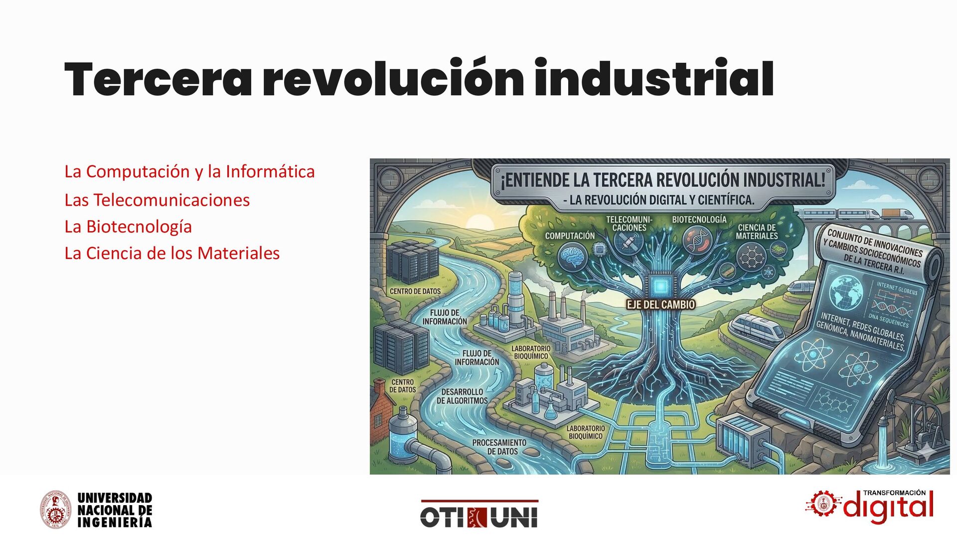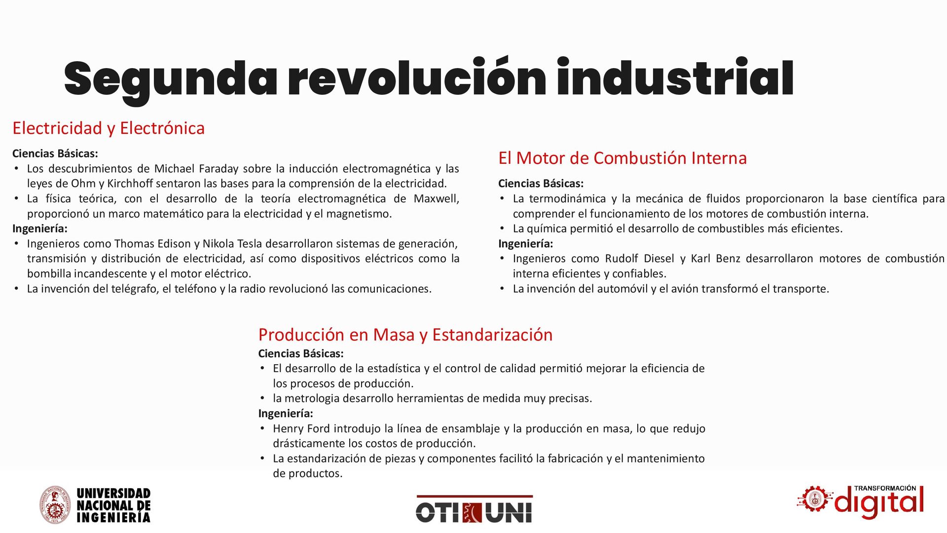 Faraday sobre la inducción electromagnética y las leyes de Ohm y Kirchhoff sentaron las bases para la comprensión de la electricidad. • La física teórica, con el desarrollo de la teoría electromagnética de Maxwell, proporcionó un marco matemático para la electricidad y el magnetismo. Ingeniería: • Ingenieros como Thomas Edison y Nikola Tesla desarrollaron sistemas de generación, transmisión y distribución de electricidad, así como dispositivos eléctricos como la bombilla incandescente y el motor eléctrico. • La invención del telégrafo, el teléfono y la radio revolucionó las comunicaciones. Electricidad y Electrónica Ciencias Básicas: • La termodinámica y la mecánica de fluidos proporcionaron la base científica para comprender el funcionamiento de los motores de combustión interna. • La química permitió el desarrollo de combustibles más eficientes. Ingeniería: • Ingenieros como Rudolf Diesel y Karl Benz desarrollaron motores de combustión interna eficientes y confiables. • La invención del automóvil y el avión transformó el transporte. El Motor de Combustión Interna Ciencias Básicas: • El desarrollo de la estadística y el control de calidad permitió mejorar la eficiencia de los procesos de producción. • la metrologia desarrollo herramientas de medida muy precisas. Ingeniería: • Henry Ford introdujo la línea de ensamblaje y la producción en masa, lo que redujo drásticamente los costos de producción. • La estandarización de piezas y componentes facilitó la fabricación y el mantenimiento de productos. Producción en Masa y Estandarización