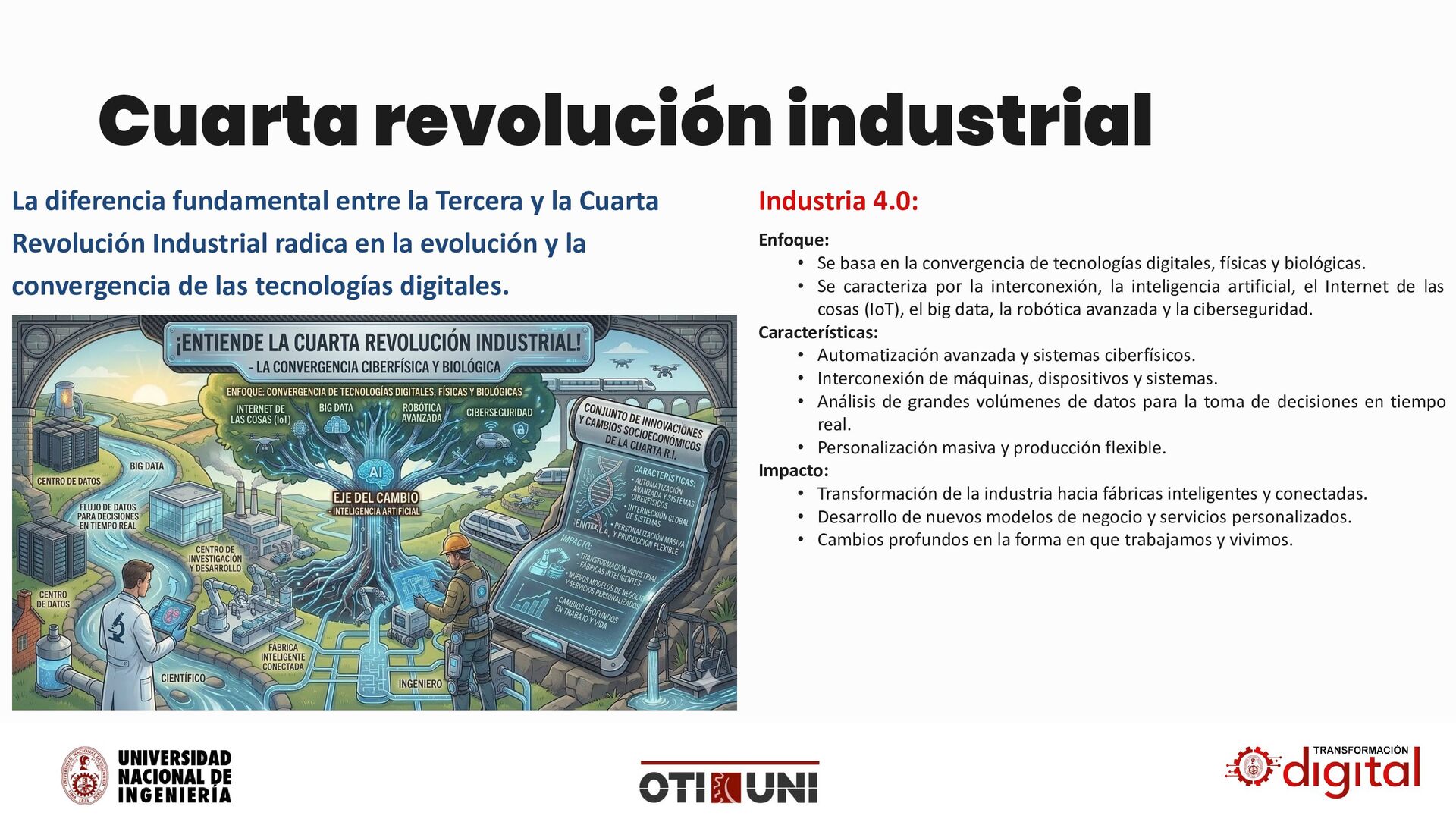 la Cuarta Revolución Industrial radica en la evolución y la convergencia de las tecnologías digitales. Enfoque: • Se basa en la convergencia de tecnologías digitales, físicas y biológicas. • Se caracteriza por la interconexión, la inteligencia artificial, el Internet de las cosas (IoT), el big data, la robótica avanzada y la ciberseguridad. Características: • Automatización avanzada y sistemas ciberfísicos. • Interconexión de máquinas, dispositivos y sistemas. • Análisis de grandes volúmenes de datos para la toma de decisiones en tiempo real. • Personalización masiva y producción flexible. Impacto: • Transformación de la industria hacia fábricas inteligentes y conectadas. • Desarrollo de nuevos modelos de negocio y servicios personalizados. • Cambios profundos en la forma en que trabajamos y vivimos. Industria 4.0: