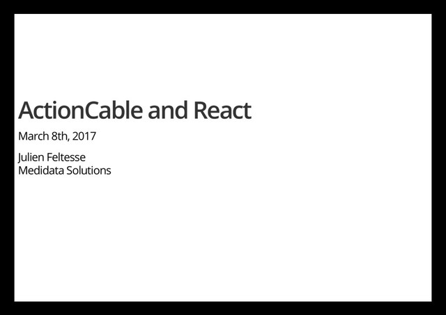 componentDidMount() { MYAPP.Hello = this; } updateName(data) { this.setState({ name: data.name }); } 6. On the server side Mount the ActionCable engine // config/routes.rb mount ActionCable.server => "/cable" Send messages ActionCable.server.broadcast("hello", serialized_name)