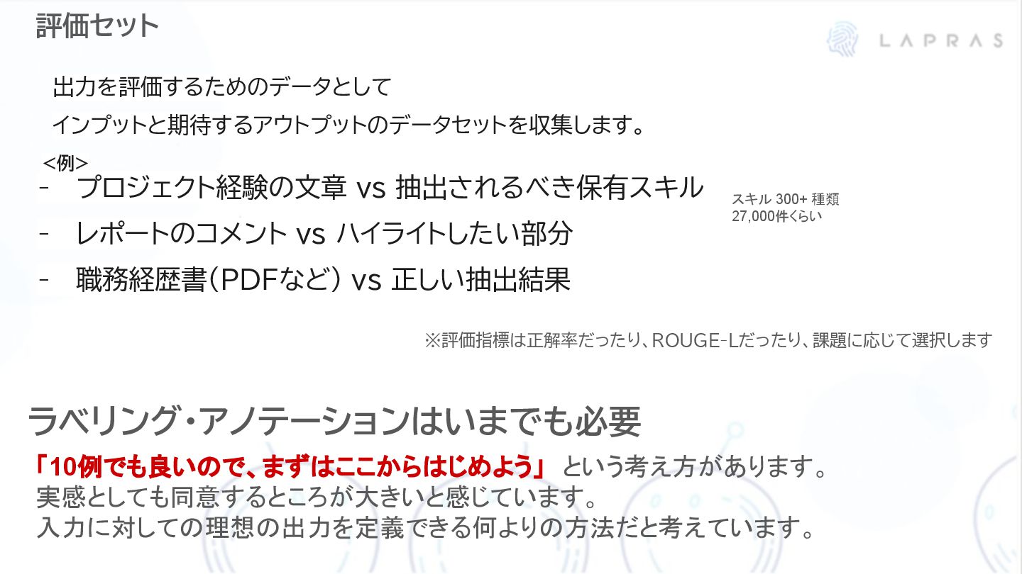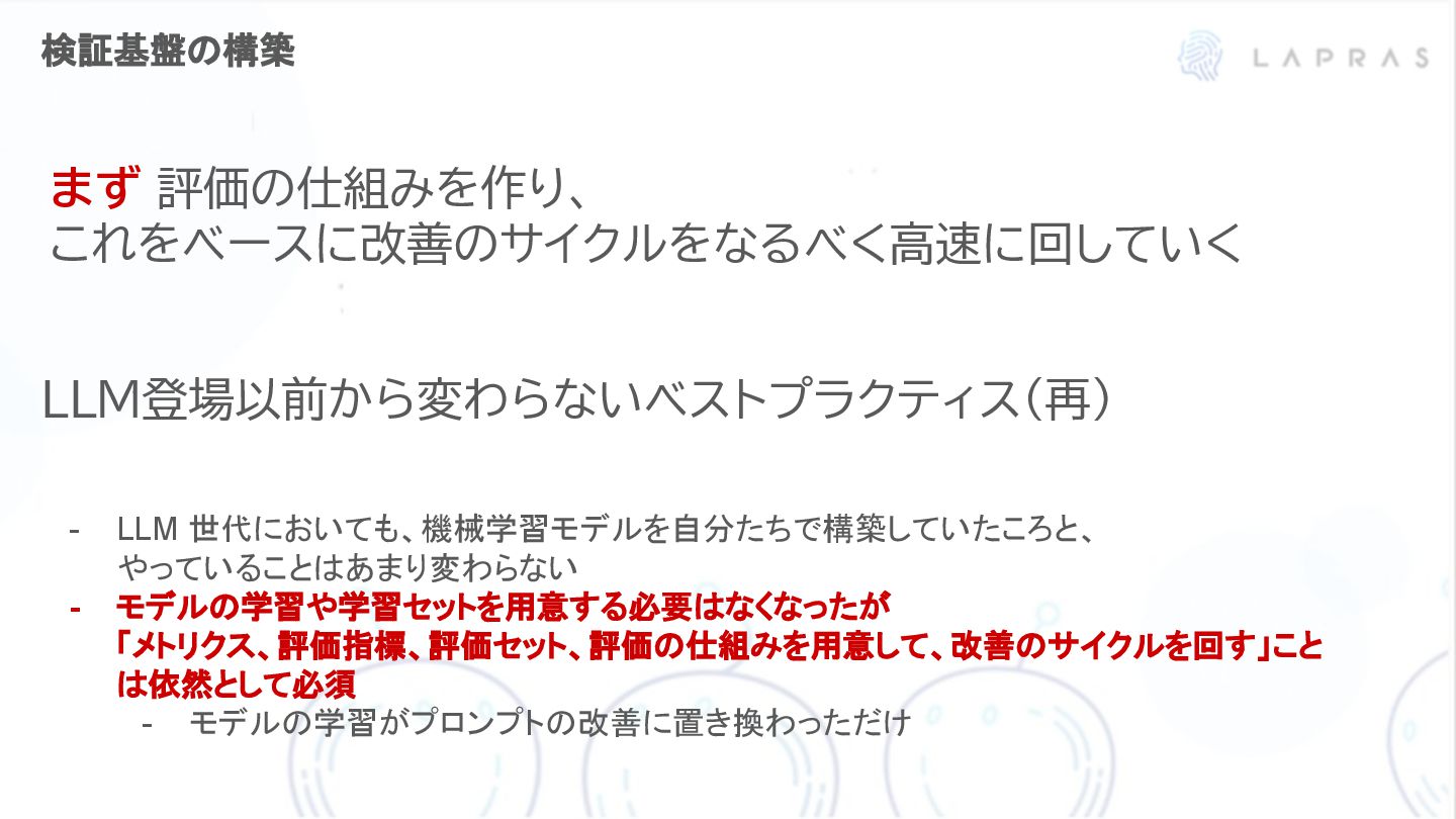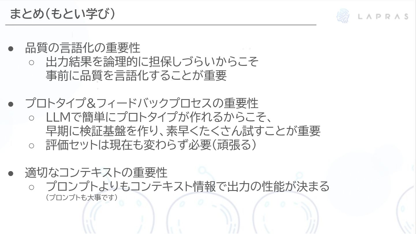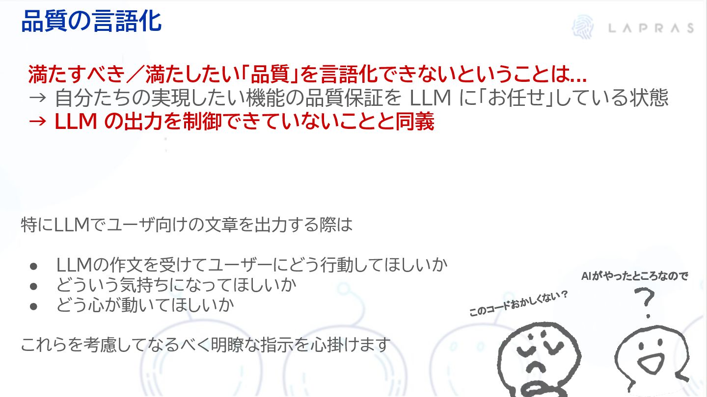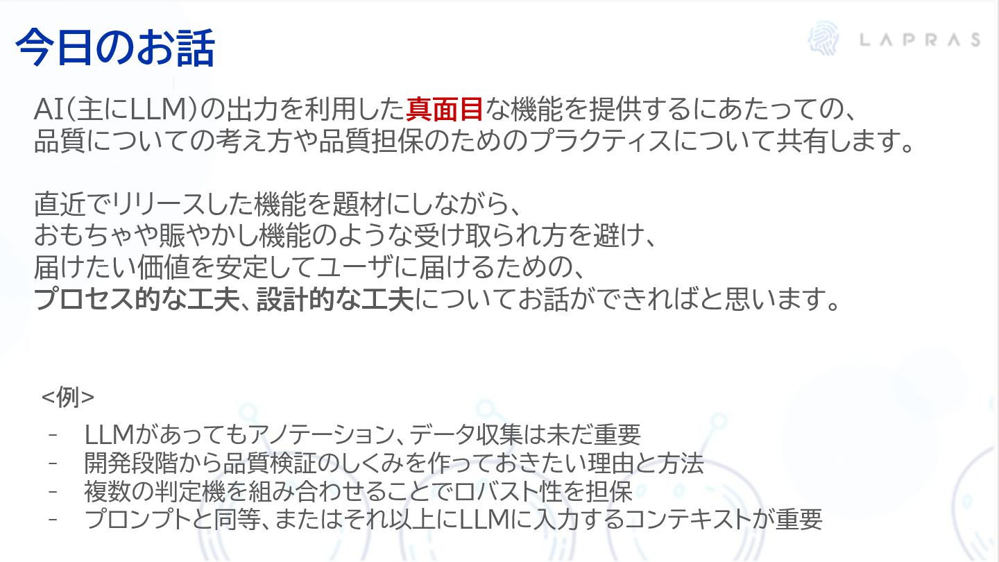 LAPRASにおけるLLMプロダクトの品質周りについての取り組みについてお話させていただきました。