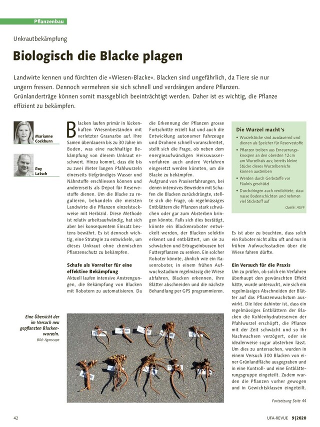 Produktion, Agroscope, 8356 Ettenhausen Roy Latsch, ehemals Agroscope, 8356 Ettenhausen Weiterführende Informationen www.agff.ch ➞ Online Shop ➞ Merkblätter ➞ Nr. 7 Wiesenblacke und Alpenblacke – vor- beugen und bekämpfen Für den Biolandbau existieren folgende zugelassene Ansätze: • Das Ausstechen mit dem Blackeneisen, bei feuchtem Boden, bis zu einer Tiefe von mindestens 15 Zentimeter ver- spricht eine hohe Erfolgsrate von 90 Prozent, ist je- doch sehr arbeits intensiv. • Blütenstände vor der Samenreife ab- schneiden, einsam- meln und entsorgen. • Die Behandlung mit Heisswasser ist ener- gieaufwändig und ebenfalls zeitinten- siv, aber im Ver- gleich zum Ausste- chen weniger anstrengend und leistungsfähiger. • Aus der Praxis ist bekannt, dass das stark frequentierte Beweiden mit Scha- fen, je nach Pflan- zenstand und Bo- denverhältnissen eine Möglichkeit bietet, Grünland bestände zu ver bessern. Blacken entziehen anderen Pflanzen Wasser und Nährstoffe. Bild: Agroscope Anschliessend wurden sie in einer Versuchsfläche wieder eingepflanzt. Während die Kontrollpflanzen unge- hindert wachsen durften, wurden bei den Pflanzen der Entblätterungs- gruppe einmal wöchentlich alle Blät- ter entfernt und gewogen. Zusätzlich wurde jede Woche je eine Pflanze aus einer der Gewichtsklas- sen ausgegraben und die Wurzel masse gewogen, um zu sehen, wel- chen Einfluss das Entblättern auf das Wurzelwachstum hat. Dieser Vorgang wurde über eine gesamte Vegeta tionsperiode durchgeführt. Im Ver- such nicht benötigte Pflanzen ver- blieben im Boden, um zu bestimmen, wie viele der Pflanzen im Folgejahr noch lebten. Schnitt schwächt die Pflanzen Die Resultate zeigen deutlich auf, dass das Entblättern die Pflanze zwar schwächt, jedoch nicht zum Abster- ben führt. Im folgenden Jahr trieben 54 Prozent der Kontrollpflanzen und 59 Prozent der entblätterten Pflan- zen neu aus. Die erste Annahme, dass die Pflanzen durch das regel mässige Abschneiden der Blätter ab- sterben, ist somit klar widerlegt. Dies belegt die verblüffende Wider- standsfähigkeit dieser Pflanze. Die Ergebnisse zeigen jedoch auch, dass regelmässiger Schnitt sowohl die Wurzelgewichte, als auch die nachwachsenden Blattgewichte re- duziert. Mit abnehmenden Wurzel- gewichten nimmt auch die nach- wachsende Blattmasse ab. Dies zeigt, dass die Kohlenhydratreserven durch das Entblättern der Pflanze reduziert werden. Damit kann die Pflanze zwar nicht abgetötet werden, aber ihr Wachs- tum ist in Schach zu halten und so werden die Erträge der Futterpflan- zen weniger vermindert. Um praxis tauglich zu werden, müsste sicherge- stellt werden, dass es ausreicht, die Blacken möglichst in den kurzen Zeitfenstern vor und zwischen den Mahdterminen zu entblättern, um Bestandesbeeinträchtigungen durch Befahren zu vermeiden. Derzeit wird in den Niederlanden zu dem Thema weitergeforscht. Zusammenfassend bleibt festzuhal- ten, dass das Entblättern von Blacken die Pflanzen zwar nicht nachhaltig aus dem Bestand entfernt, aber sie dennoch so schwächt, dass Einbus sen im Futterertrag massgeblich re- duziert werden könnten. Eine regelmässige robotergesteuerte Entblätterung in aufwachsenden Grünlandbeständen würde daher ei- nen plausiblen Ansatz zur ökologi- schen Blackenbekämpfung bieten. Reif für die Praxis ist die Forschung aktuell noch nicht. Unter anderem gilt es noch zu klären, wie häufig eine Entblätterung in der Praxis stattfinden müsste, ob es ausreicht, die Blacken zu entblättern wenn der Grasbestand noch sehr niedrig ist, und wie ein solcher Roboter über- haupt aussehen könnte. n Bio Tipp