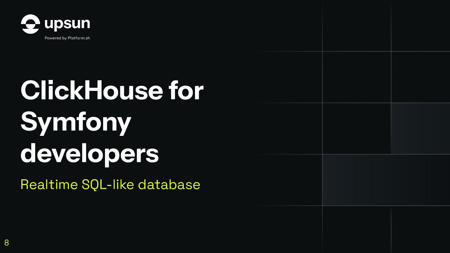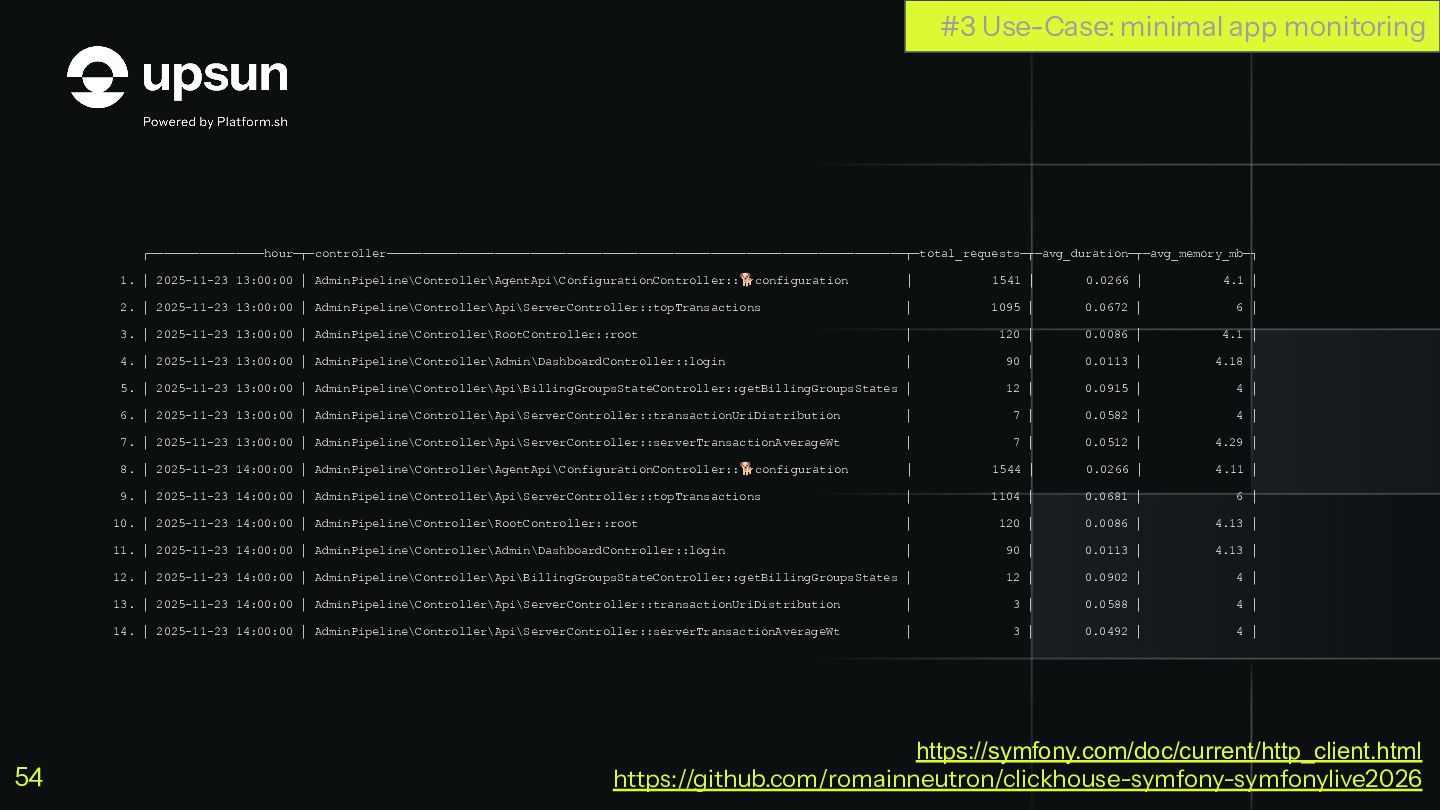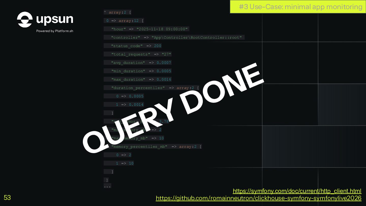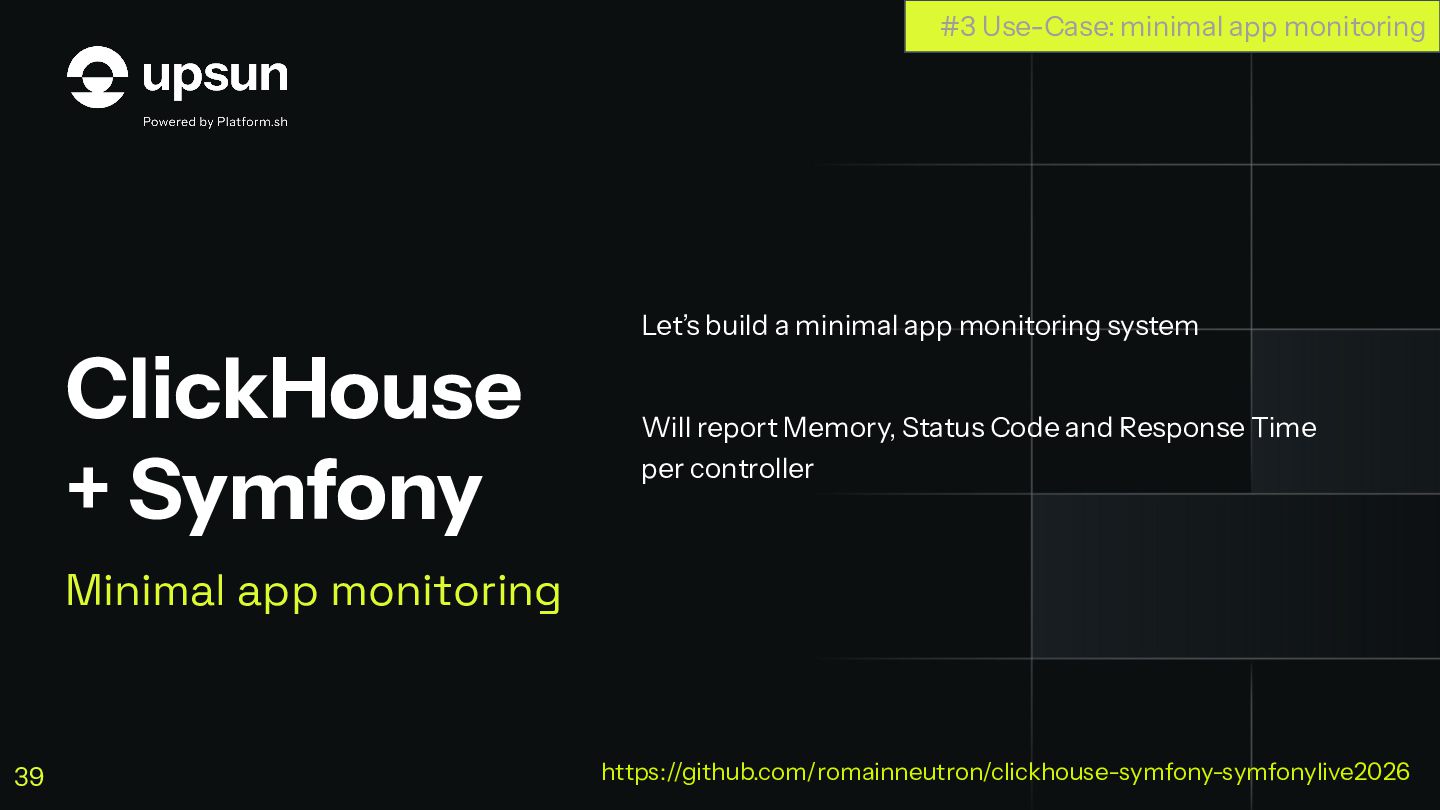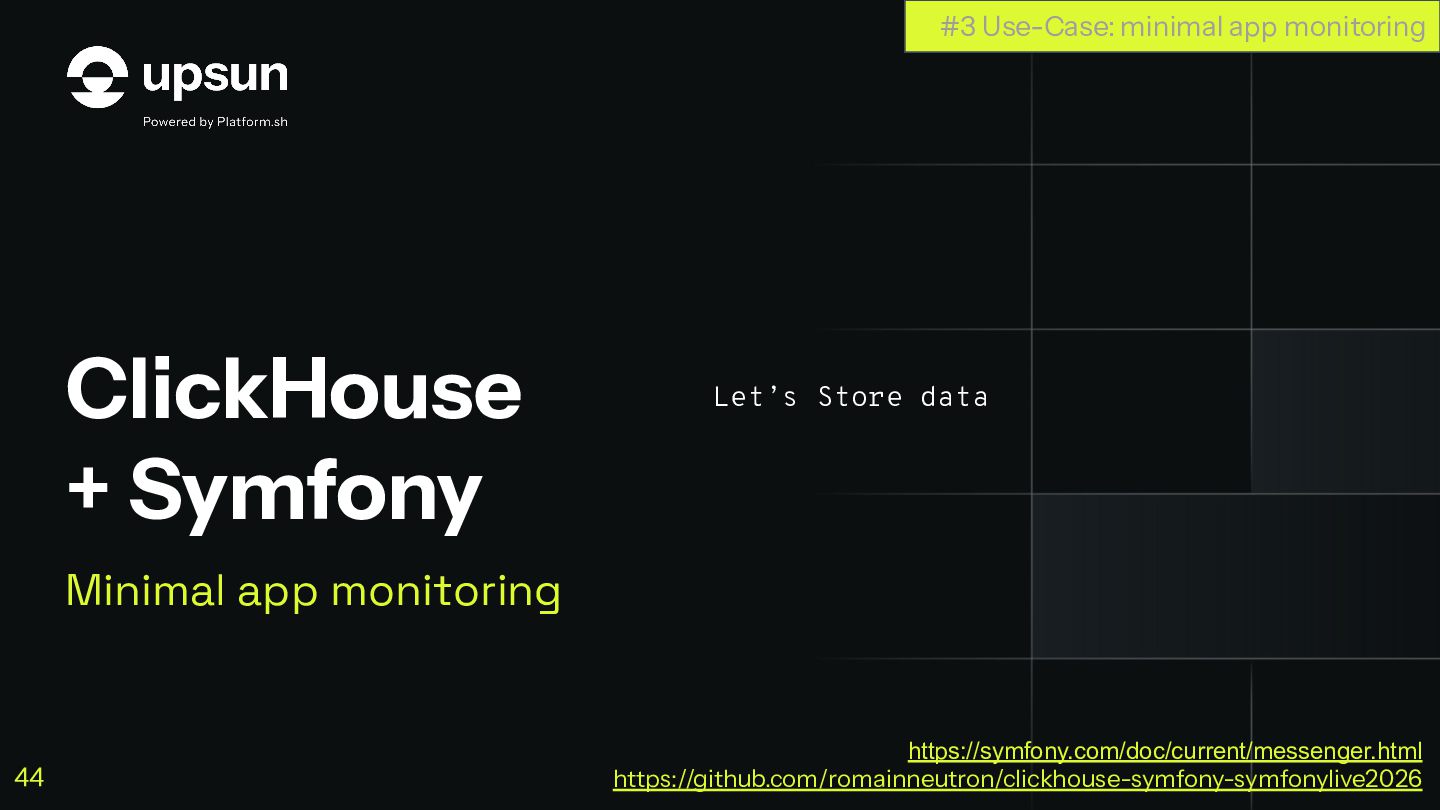 C'est à ce moment que ClickHouse vous sauve. C'est une base de données orientée colonnes super-puissante qui va vous simplifier la vie pour agréger des données en temps réel, tout en restant dans votre stack Symfony habituelle.