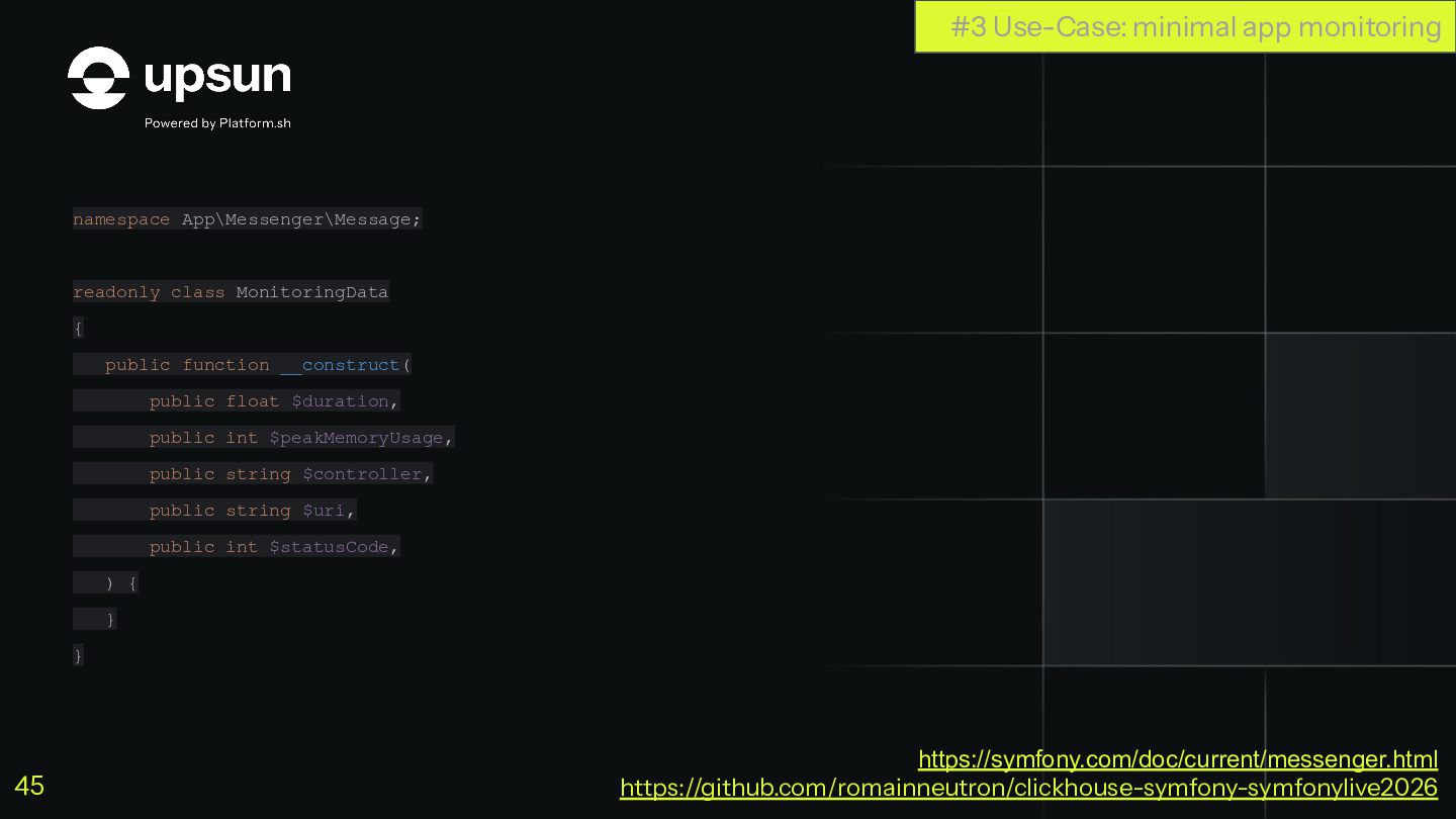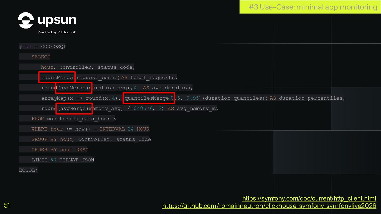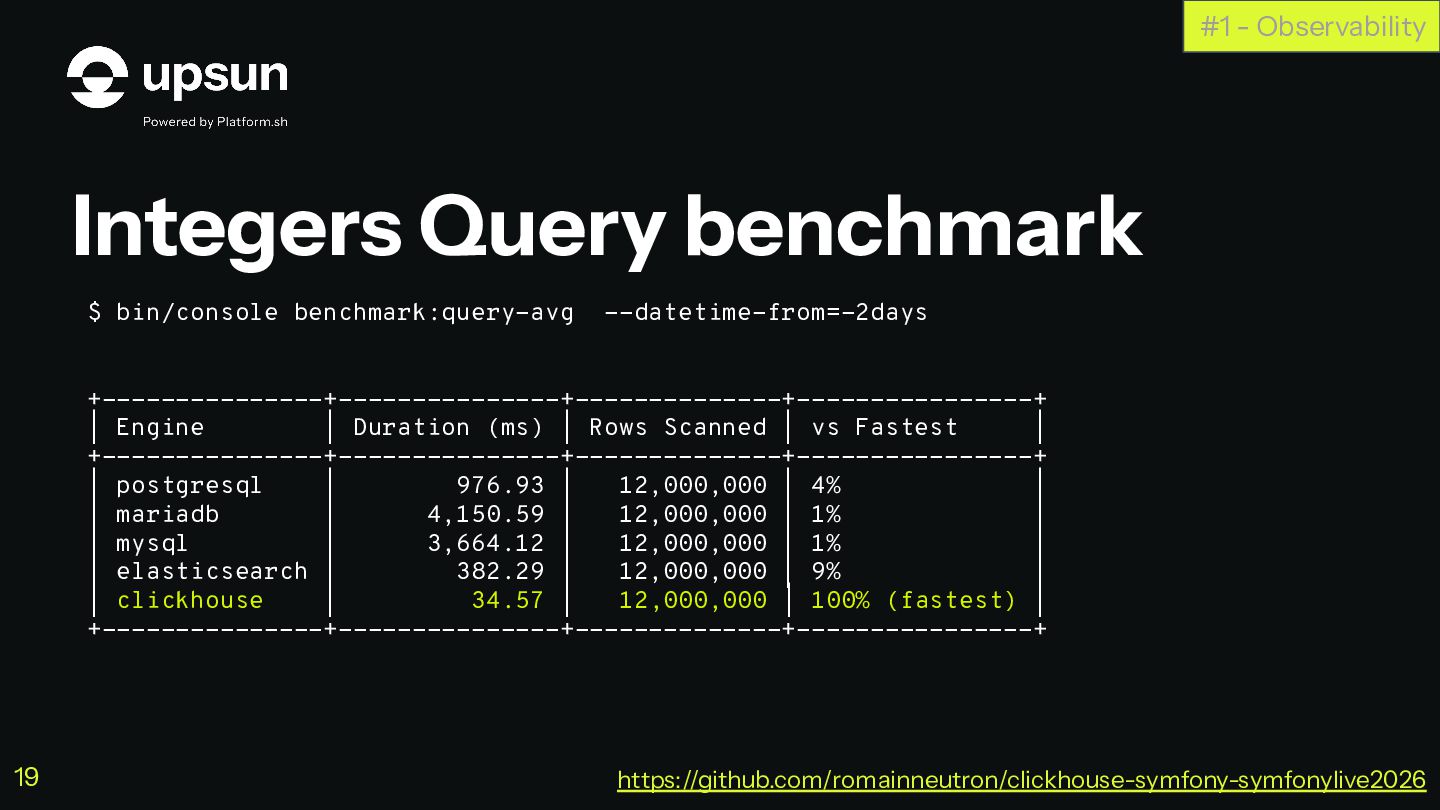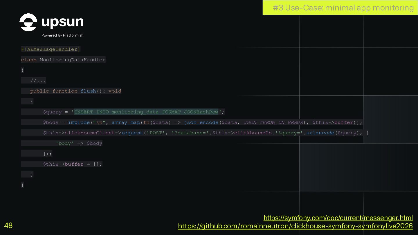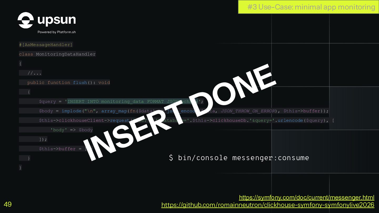 C'est à ce moment que ClickHouse vous sauve. C'est une base de données orientée colonnes super-puissante qui va vous simplifier la vie pour agréger des données en temps réel, tout en restant dans votre stack Symfony habituelle.