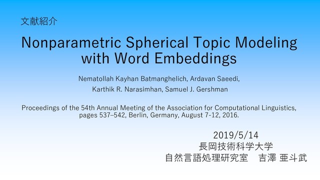 Nonparametric Spherical Topic Modeling with Word Embeddings Nematollah Kayhan Batmanghelich,