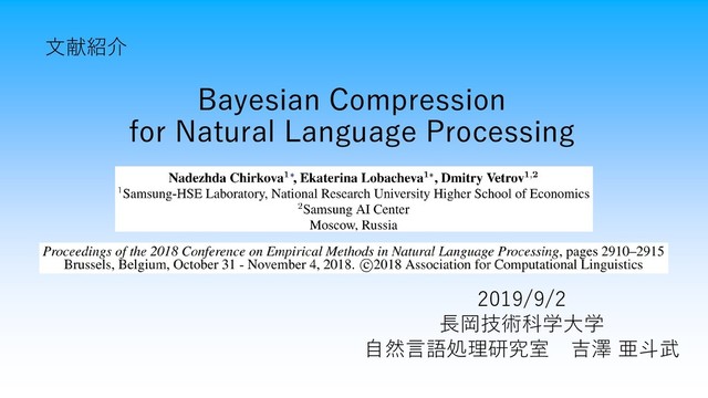 Bayesian Compression for Natural Language Processing 文献紹介 2019/9/2 長岡技術科学大学 自然言語処理研究室