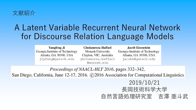 Abstract ・単語のシーケンスや隣接する文の潜在的な談話関係を モデル化する潜在変数RNN(LVRNN)を提案 ・談話関係を潜在変数で表し,タスクに応じて予測または 周辺化することが可能 ・談話関係の分類,対話行為の分類,談話における言語モデルの タスクで先行研究よりも優れていることを示した. 2