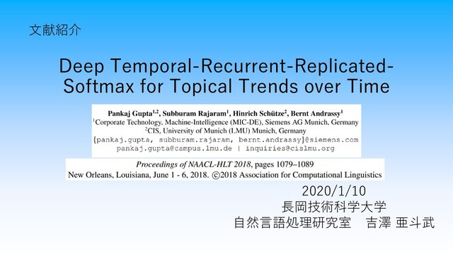 Deep Temporal-Recurrent-Replicated- Softmax for Topical Trends over Time 文献紹介 2020/1/10