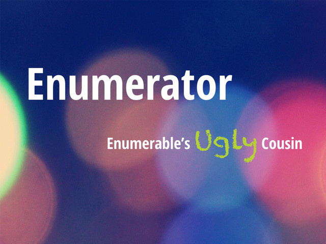 a a, b = b, a + b end end def a = b = n.times a, b = b, a + b end fibonacci(7).each { |a| puts a } fibonacci(25).map { |a| a * 3 }.select(&:odd?) fibonacci(100).find { |a| a > 50 } return to_enum(__method__, n) unless block_given? ] [ Enumerable!