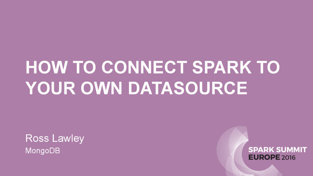 Spark may have taken the big data world by storm by being super fast and easy to use. However, by design, Spark is not a datastore and only supports a limited number of sources for data. So how can you integrate your datasource with Spark? In this talk we’ll look at how to successfully write your own Spark connector. We’ll look in depth at the the lessons learnt writing a new Spark Connector for MongoDB, and how you can apply those lessons to any potential data source as you build your own connector. At the core of Spark is the RDD, so the first step in building your connector is being able to create an RDD and partition data efficiently. Initially, it’s easiest to focus on Scala, but we’ll look at how to expand and support Java at the same time, and why it’s a good idea. We’ll look at how you can test the code and prove the connector works before expanding it to other Spark features. The next step is to expose the connector to Spark’s fastest growing features; Spark Streaming and Spark SQL. Once we have a fully functioning Spark Connector for the JVM, we’ll look at how easy it is to extend it to support Python and R.