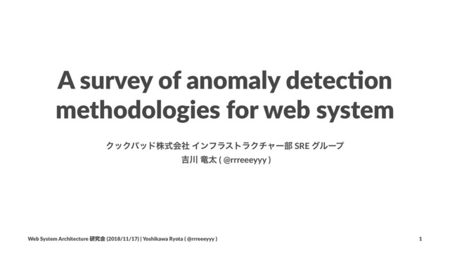 A survey. ACM compuCng surveys (CSUR), 2009, 41.3: 15. 2. KITAGAWA, G. Introducing to Time Series Modeling, Chapman & Hall. 2010. 3. HOCHENBAUM, Jordan; VALLIS, Owen S.; KEJARIWAL, Arun. AutomaCc anomaly detecCon in the cloud via staCsCcal learning. arXiv preprint arXiv:1704.07706, 2017. 4. ISLAM, Md Rafiqul, et al. A Comprehensive Survey of Time Series Anomaly DetecCon in Online Social Network Data. InternaConal Journal of Computer ApplicaCons, 2017, 180.3: 13-22. 5. HARVEY, Andrew C.; PETERS, Simon. EsCmaCon procedures for structural Cme series models. Journal of ForecasCng, 1990, 9.2: 89-108. 6. LAPTEV, Nikolay, et al. Time-series extreme event forecasCng with neural networks at uber. In: InternaConal Conference on Machine Learning. 2017. p. 1-5. 7. TAYLOR, Sean J.; LETHAM, Benjamin. ForecasCng at scale. The American StaCsCcian, 2018, 72.1: 37-45. Web System Architecture ݚڀձ (2018/11/17) | Yoshikawa Ryota ( @rrreeeyyy ) 26