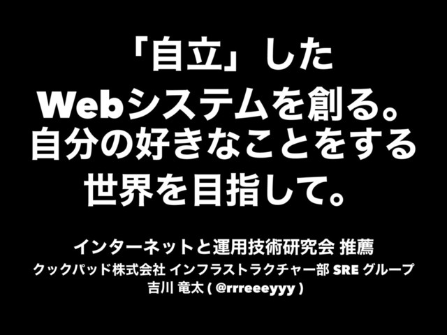 ʮཱࣗʯͨ͠ WebγεςϜΛΔɻ ࣗͷ͖ͳ͜ͱΛ͢Δ ੈքΛࢦͯ͠ɻ Πϯλʔωοτͱӡ༻ٕज़ݚڀձ ਪન ΫοΫύουגࣜձࣾ ΠϯϑϥετϥΫνϟʔ෦ SRE άϧʔϓ