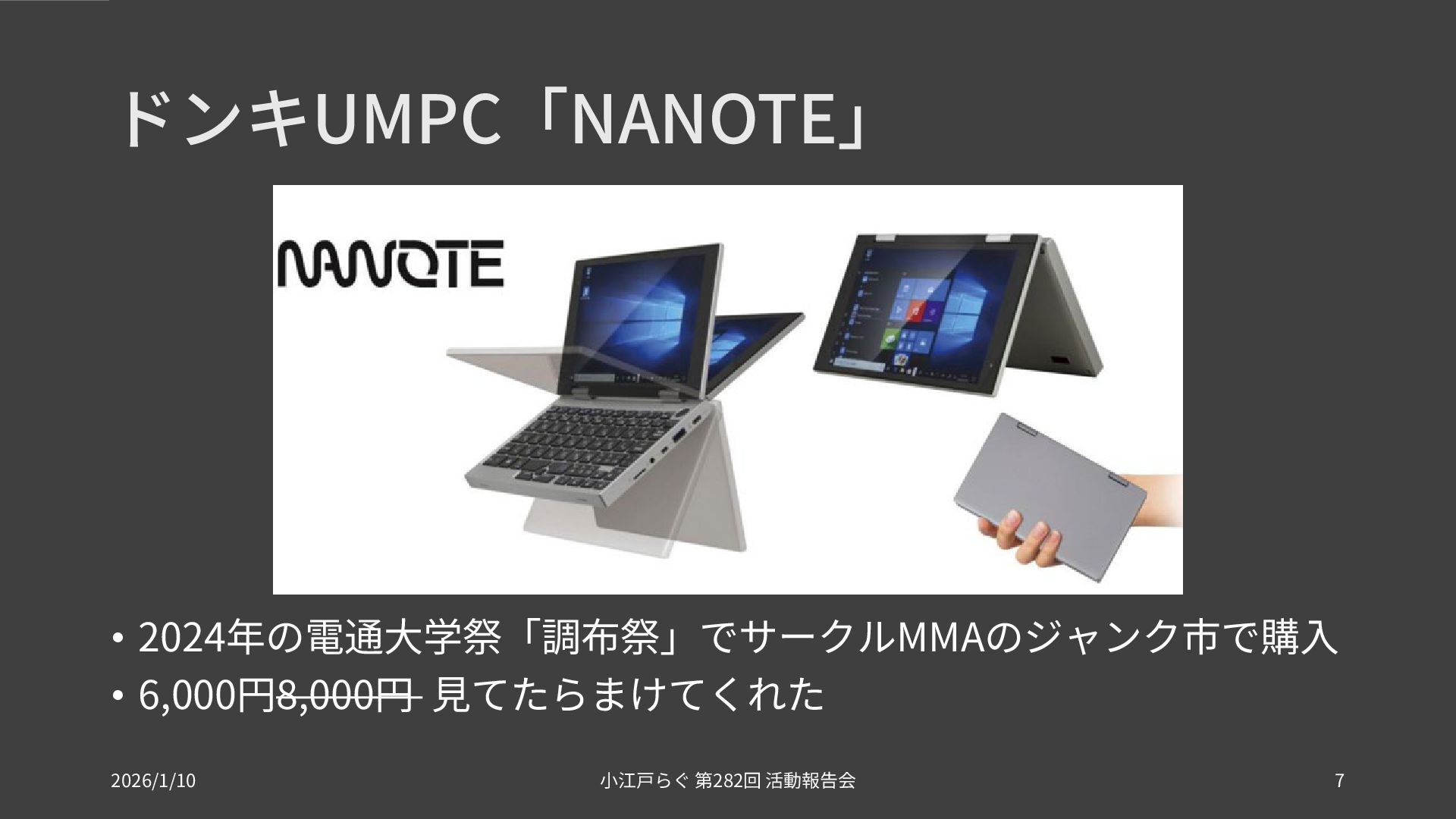 ドンキUMPC「NANOTE」 • 2024年の電通大学祭「調布祭」でサークルMMAのジャンク市で購入 • 6,000円8,000円 見てたらまけてくれた 2026/1/10 282 小江戸らぐ 第