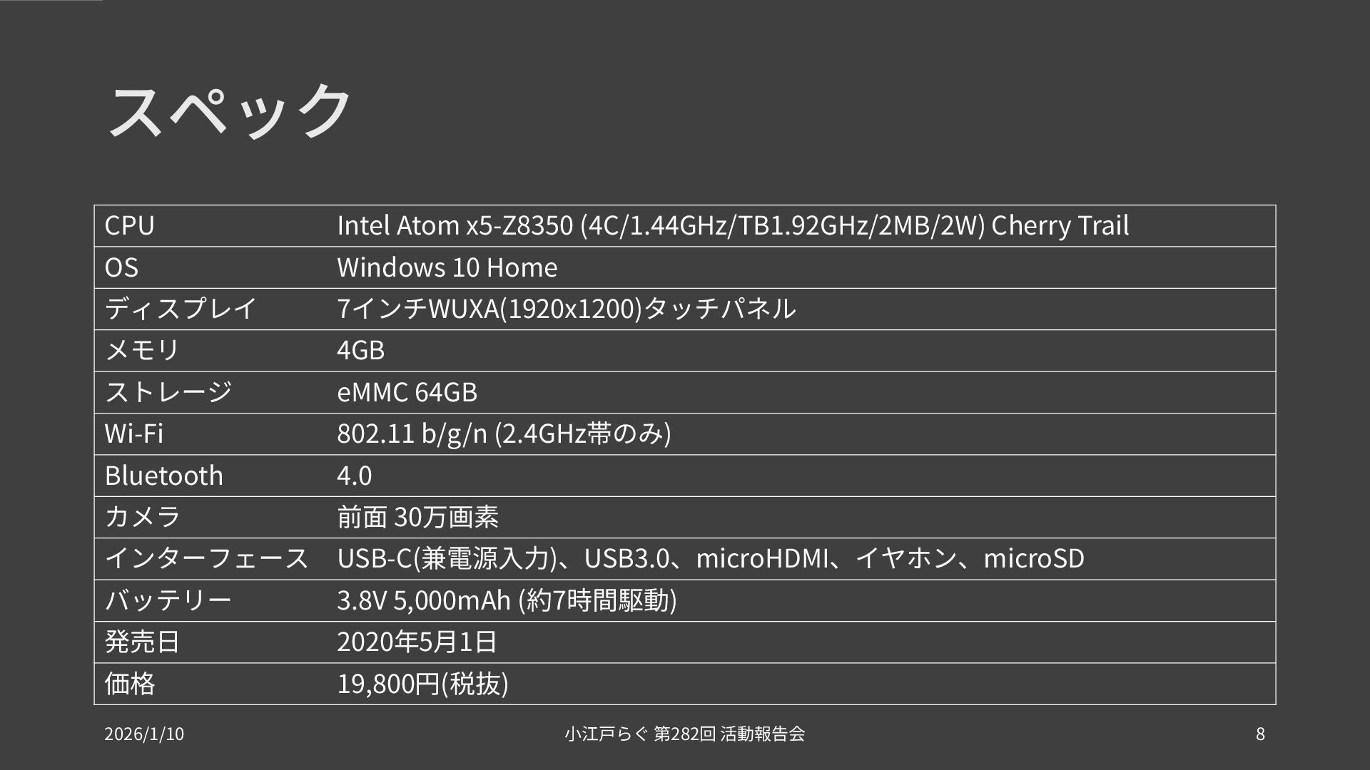 10 Home ディスプレイ 7インチWUXA(1920x1200)タッチパネル メモリ 4GB ストレージ eMMC 64GB Wi-Fi 802.11 b/g/n (2.4GHz帯のみ) Bluetooth 4.0 カメラ 前面 30万画素 インターフェース USB-C(兼電源入力)、USB3.0、microHDMI、イヤホン、microSD バッテリー 3.8V 5,000mAh (約7時間駆動) 発売日 2020年5月1日 価格 19,800円(税抜) 2026/1/10 282 小江戸らぐ 第 回 活動報告会 8