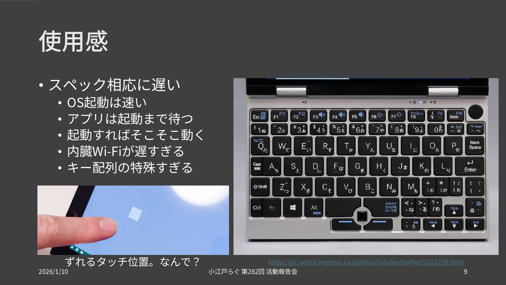 内臓Wi-Fiが遅すぎる • キー配列の特殊すぎる ずれるタッチ位置。なんで? https://pc.watch.impress.co.jp/docs/column/hothot/1251220.html 2026/1/10 282 小江戸らぐ 第 回 活動報告会 9