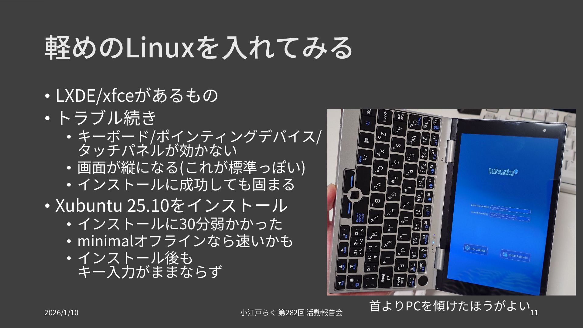• インストールに成功しても固まる • Xubuntu 25.10をインストール • インストールに30分弱かかった • minimalオフラインなら速いかも • インストール後も キー入力がままならず 首よりPCを傾けたほうがよい 2026/1/10 282 小江戸らぐ 第 回 活動報告会 11