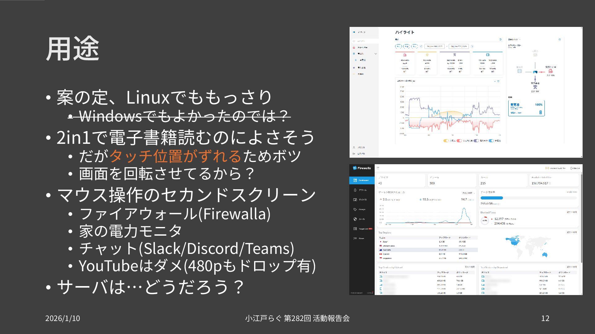 画面を回転させてるから? • マウス操作のセカンドスクリーン • ファイアウォール(Firewalla) • 家の電力モニタ • チャット(Slack/Discord/Teams) • YouTubeはダメ(480pもドロップ有) • サーバは…どうだろう? 2026/1/10 282 小江戸らぐ 第 回 活動報告会 12