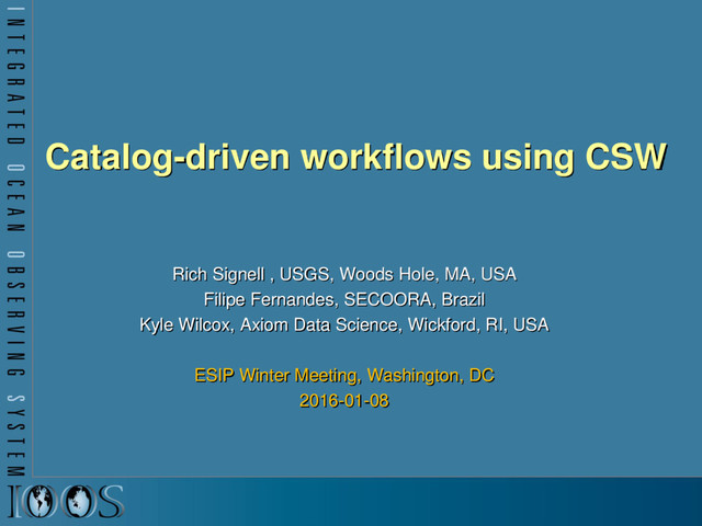 NcML NcML NcML NcML Common Data Model OPeNDAP NetCDF Subset THREDDS Data Server Standardized (CF-1.6, SGRID-0.1, UGRID-0.9) Virtual Datasets Nonstandard Model Output Data Files Web Services Matlab Panoply IDV Clients NetCDF -Java Library or Broker WMS ncISO ArcGIS NetCDF4 -Python FVCOM Python EDC NetCDF-Java SOS Geoportal Server GeoNetwork CKAN Observed data (buoy, gauge, ADCP, glider) Web Portals pycsw NcML Grid TimeSeries Profile Trajectory TimeSeriesProfile Sgrid Ugrid Nonstandard Data Files Catalog Services Rectilinear ERDDAP WCS