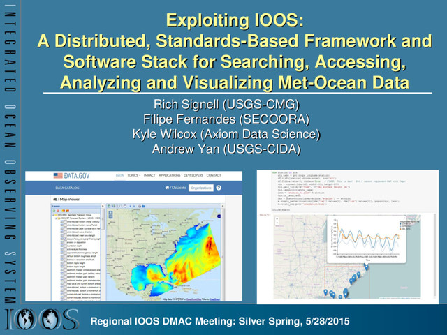 Searching, Accessing, Analyzing and Visualizing Met-Ocean Data Rich Signell (USGS-CMG) Filipe Fernandes (SECOORA) Kyle Wilcox (Axiom Data Science) Andrew Yan (USGS-CIDA) Regional IOOS DMAC Meeting: Silver Spring, 5/28/2015