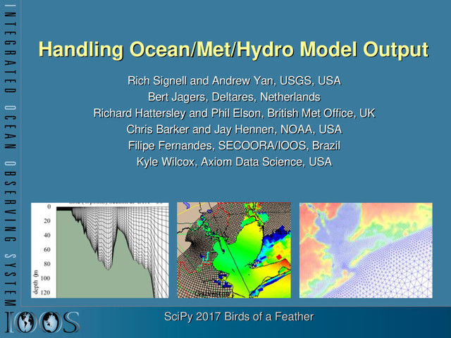 USA Bert Jagers, Deltares, Netherlands Richard Hattersley and Phil Elson, British Met Office, UK Chris Barker and Jay Hennen, NOAA, USA Filipe Fernandes, SECOORA/IOOS, Brazil Kyle Wilcox, Axiom Data Science, USA SciPy 2017 Birds of a Feather