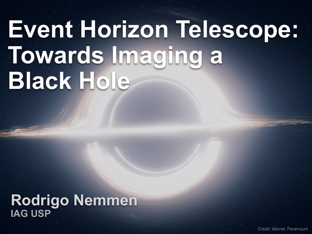mm- wavelengths Goals: Direct image of event horizons Test general relativity (strong field) Probe black hole “gastrophysics” First observation with full array: April 2017 Work in progress… R. Nemmen Rodrigo Nemmen IAG USP