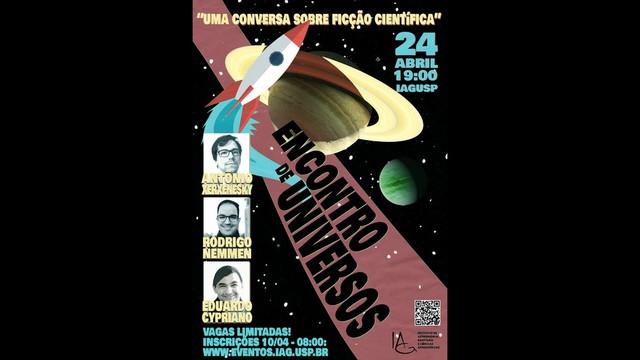 Em que pontos a ciência e a arte literária tangenciam? Esta atividade reunirá um astrofísico e um escritor para dialogar e oferecer diferentes pontos de vista sobre o gênero da ficção científica, no qual a criação artística e a reflexão filosófica tem como ponto de partida descobertas da ciência e as especulações que podem ser elaboradas tendo em mente as revoluções tecnológicas de nosso tempo. A conversa contará com o astrofísico Rodrigo Nemmen, professor no IAG USP, e o escritor Antônio Xerxenesky, doutor em literatura pela FFLCH-USP e autor de vários livros de ficção. Mediação de Eduardo Cypriano.