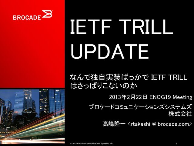 Brocade Communications Systems, Inc. I hope that we shall one day see A graph more lovely than a tree. A graph to boost efficiency While still configuration-free. ツリーもうやめよう でも複雑な設定はNO! 4