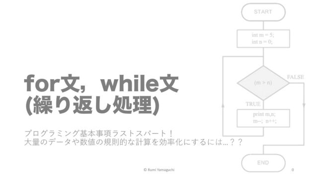 着いていない シーケンス内の 値を順に処理 終わり True False 今回の処理は, print()で値の表⽰. 実⾏すると,もちろん • for⽂内でしか使えない. • 1つの値しか代⼊できない (シーケンス内の1つ1つを 前から順に代⼊するため). シーケンス 今回はsushi_menuという 変数名のリスト for 変数名 in シーケンス名: • コロン(Shift +け) • for⽂内はインデントを下げる (if⽂同様 tabキー or 半⾓4字) © Rumi Yamaguchi 8
