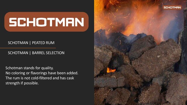 patent. • The ingredients, which come from the sugar cane, are smoked on a blend of German and Irish peat. • The duration of smoking per batch is approximately 2 to 3 weeks. • The process of smoking is still developing, but the basic process remains the same. • Because the raw materials are smoked before the distillation, this is the only rum to be called Peated Rum. So Peated before the for Rum. All others are Rum Peat finish, matured in an ex-Islay whiskey barrel. • The wash is fermented for about 2 weeks • Distillation with a copper pot still and column. • On the barrel and in the glass. • There are no added flavors, colors, or fragrances. The rum is not cold-filtered and no sugar is added. • The patent expires in 20 years What is Peated Rum