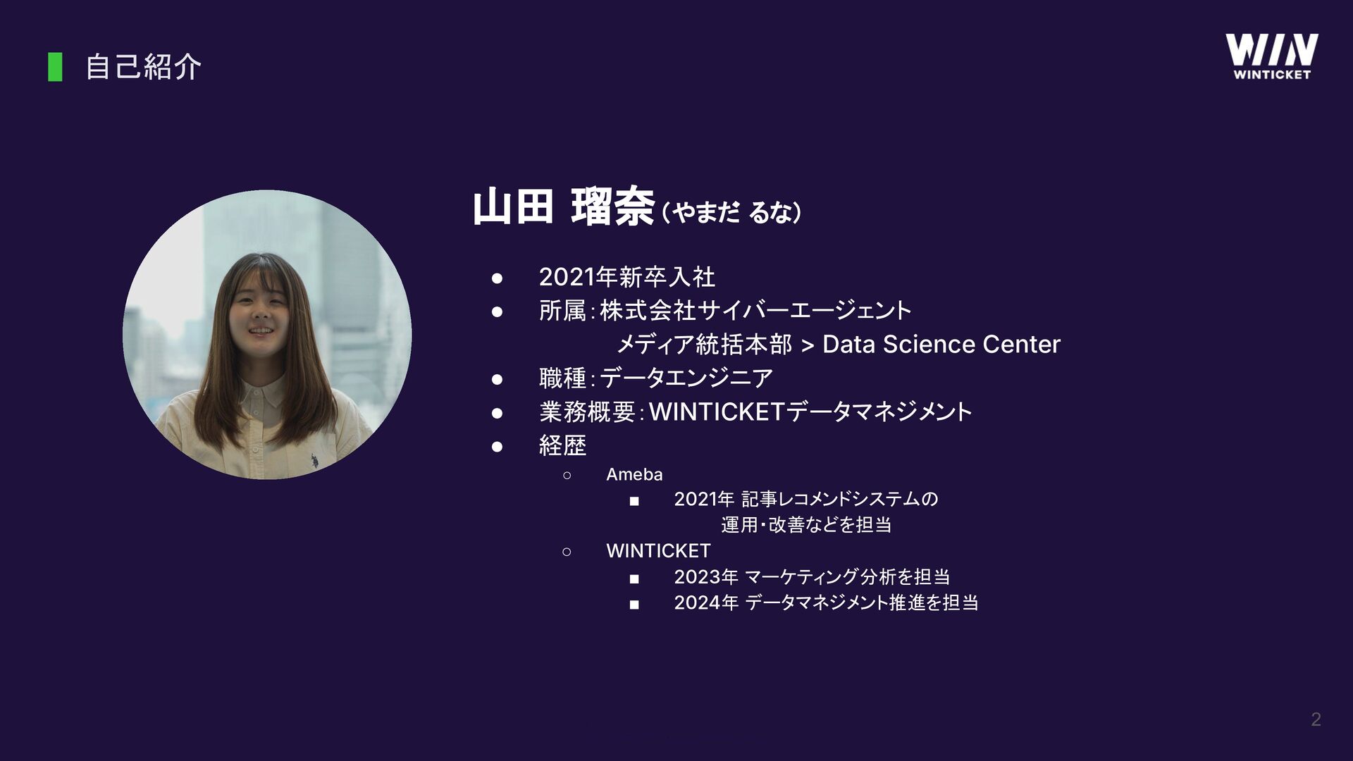 Data Science Center • 職種:データエンジニア • 業務概要:WINTICKETデータマネジメント • 経歴 ◦ Ameba ▪ 2021年 記事レコメンドシステムの 運用・改善などを担当 ◦ WINTICKET ▪ 2023年 マーケティング分析を担当 ▪ 2024年 データマネジメント推進を担当 自己紹介
