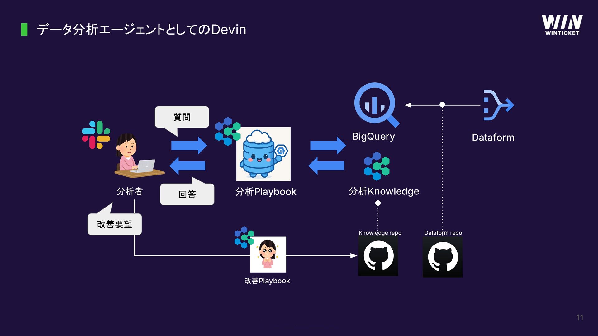 データ分析エージェントとしてのDevin 11 質問 回答 分析者 BigQuery Dataform 改善要望 分析Playbook 分析Knowledge