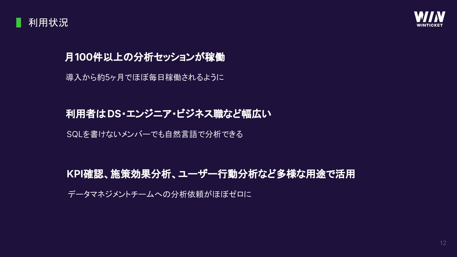 12 利用状況 月100件以上の分析セッションが稼働 導入から約5ヶ月でほぼ毎日稼働されるように 利用者はDS・エンジニア・ビジネス職など幅広い SQLを書けないメンバーでも自然言語で分析できる KPI確認、施策効果分析、ユーザー行動分析など多様な用途で活用 データマネジメントチームへの分析依頼がほぼゼロに