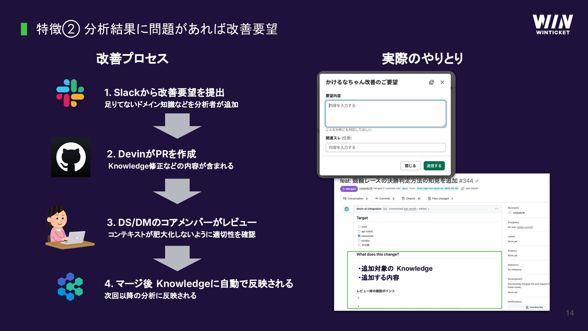 改善プロセス 1. Slackから改善要望を提出 足りてないドメイン知識などを分析者が追加 実際のやりとり 特徴② 分析結果に問題があれば改善要望 2. DevinがPRを作成 Knowledge修正などの内容が含まれる