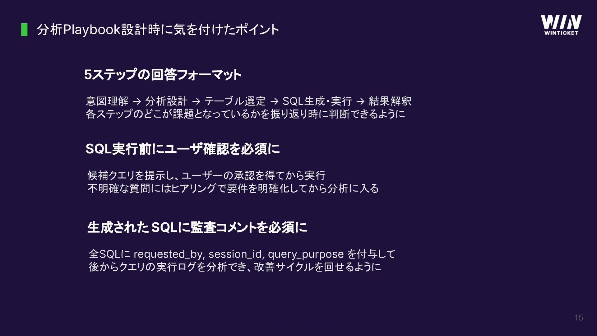 15 分析Playbook設計時に気を付けたポイント 5ステップの回答フォーマット 意図理解 → 分析設計 → テーブル選定 → SQL生成・実行