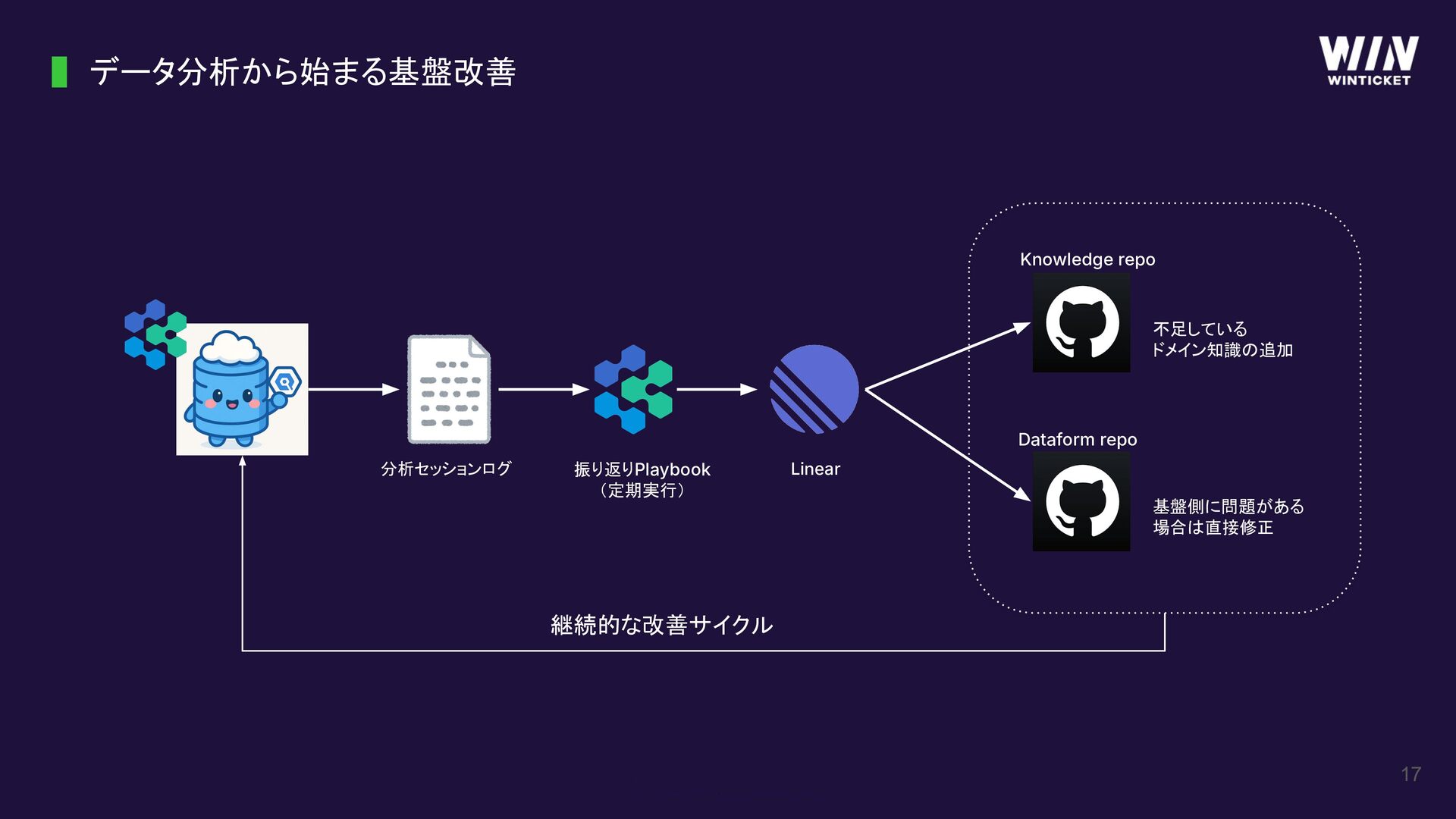 データ分析から始まる基盤改善 17 分析セッションログ Linear 振り返りPlaybook (定期実行) Dataform repo Knowledge repo