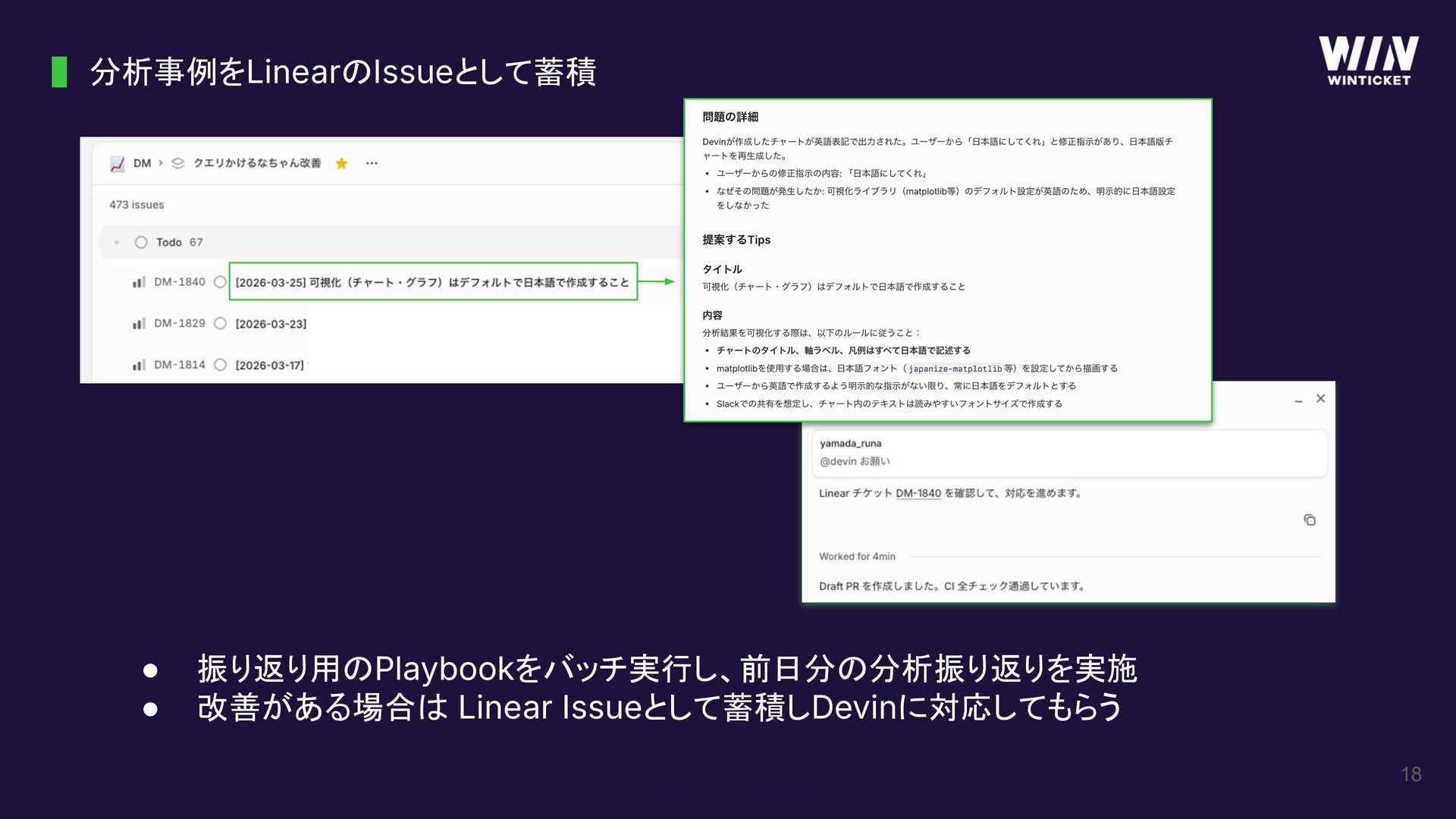 分析事例をLinearのIssueとして蓄積 18 • 振り返り用のPlaybookをバッチ実行し、前日分の分析振り返りを実施 • 改善がある場合は Linear Issueとして蓄積しDevinに対応してもらう