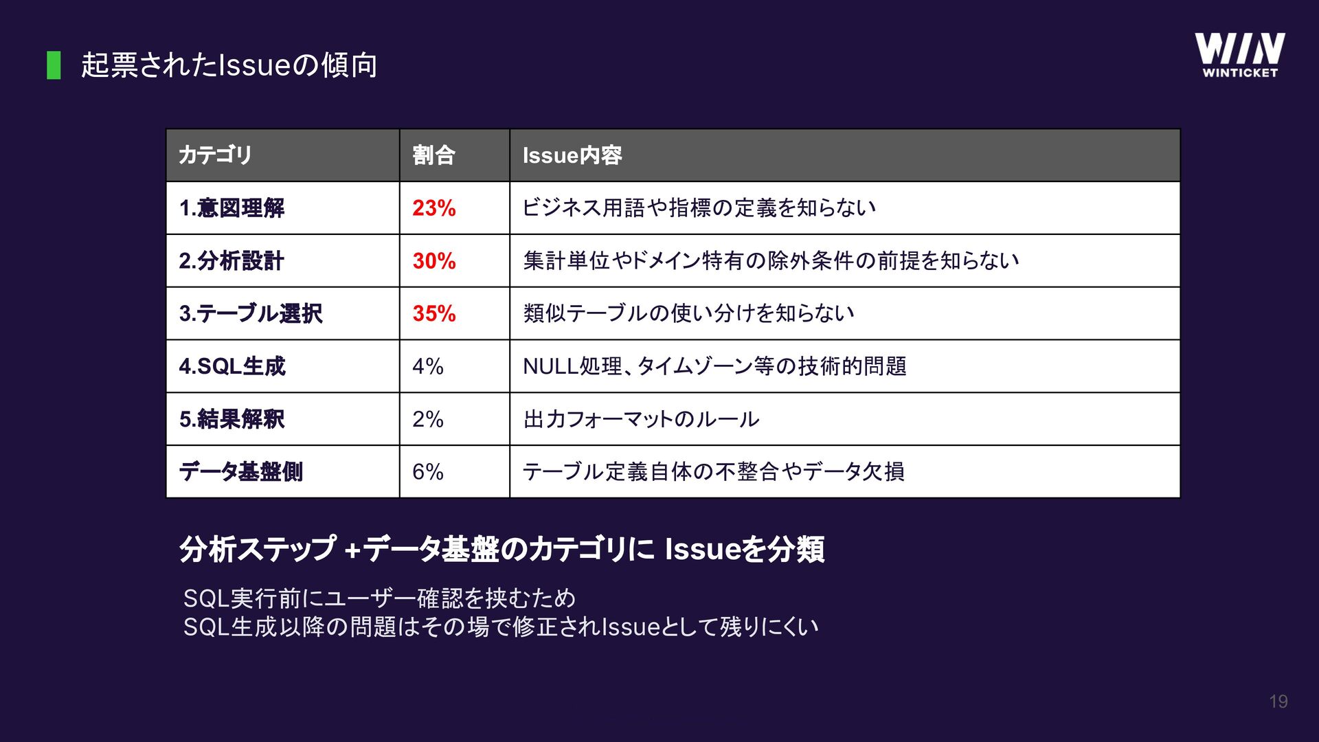 集計単位やドメイン特有の除外条件の前提を知らない 3.テーブル選択 35% 類似テーブルの使い分けを知らない 4.SQL生成 4% NULL処理、タイムゾーン等の技術的問題 5.結果解釈 2% 出力フォーマットのルール データ基盤側 6% テーブル定義自体の不整合やデータ欠損 分析ステップ +データ基盤のカテゴリに Issueを分類 SQL実行前にユーザー確認を挟むため SQL生成以降の問題はその場で修正されIssueとして残りにくい