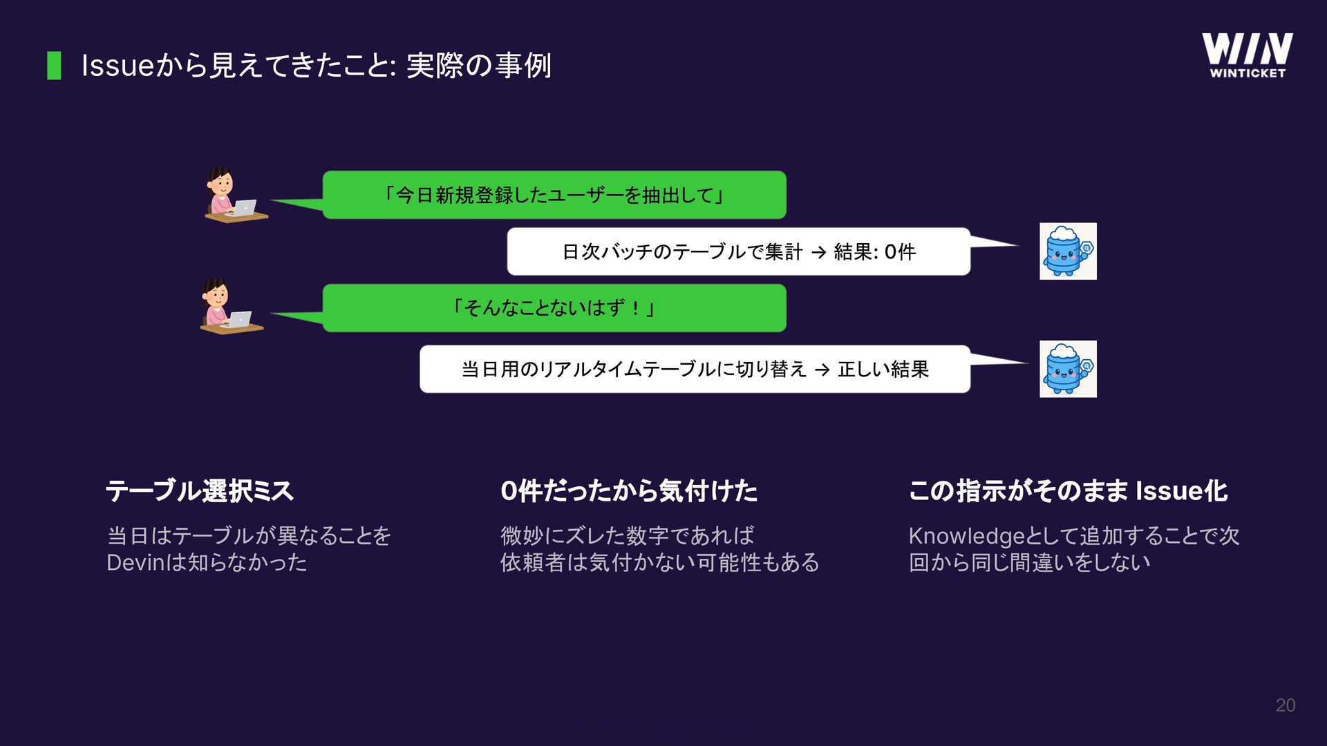 → 正しい結果 テーブル選択ミス 当日はテーブルが異なることを Devinは知らなかった 0件だったから気付けた 微妙にズレた数字であれば 依頼者は気付かない可能性もある この指示がそのまま Issue化 Knowledgeとして追加することで次 回から同じ間違いをしない