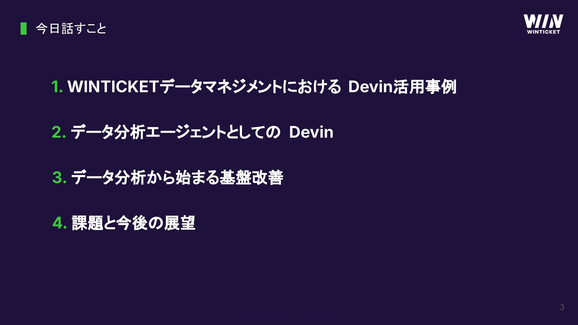 3 1. WINTICKETデータマネジメントにおける Devin活用事例 2. データ分析エージェントとしての Devin 3. データ分析から始まる基盤改善 今日話すこと
