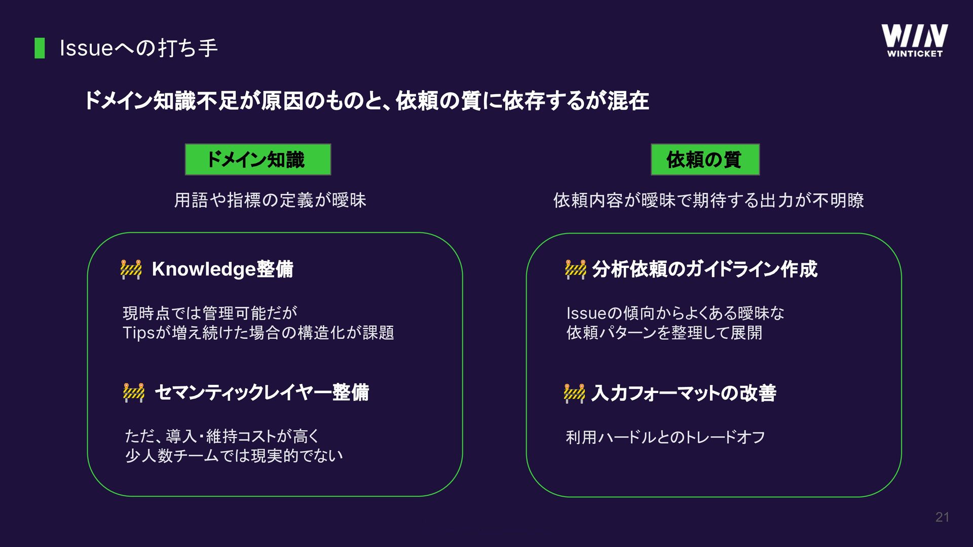 Issueの傾向からよくある曖昧な 依頼パターンを整理して展開 🚧 セマンティックレイヤー整備 ただ、導入・維持コストが高く 少人数チームでは現実的でない 🚧 入力フォーマットの改善 利用ハードルとのトレードオフ ドメイン知識 依頼の質 依頼内容が曖昧で期待する出力が不明瞭