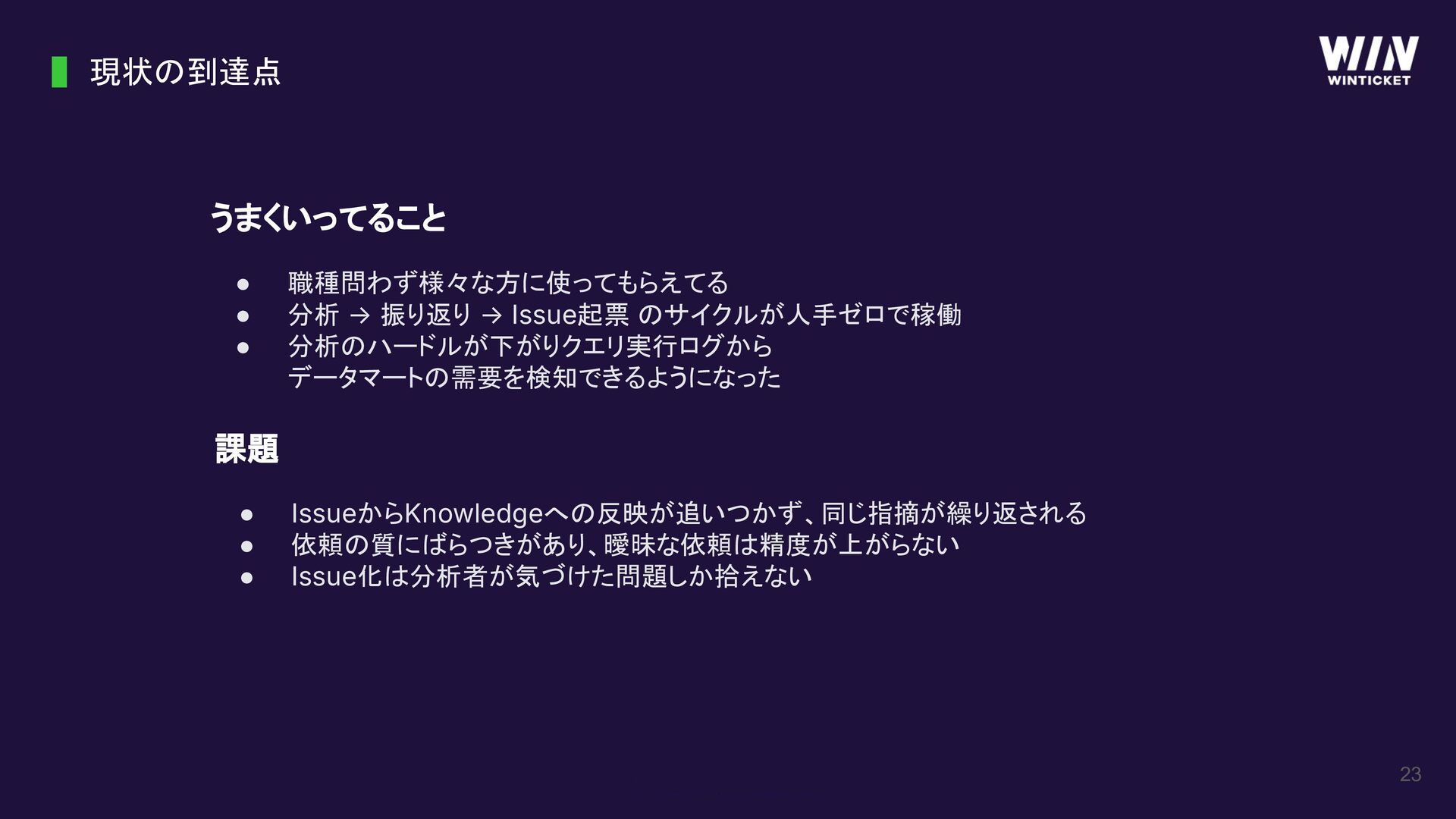 Issue起票 のサイクルが人手ゼロで稼働 • 分析のハードルが下がりクエリ実行ログから データマートの需要を検知できるようになった 課題 • IssueからKnowledgeへの反映が追いつかず、同じ指摘が繰り返される • 依頼の質にばらつきがあり、曖昧な依頼は精度が上がらない • Issue化は分析者が気づけた問題しか拾えない